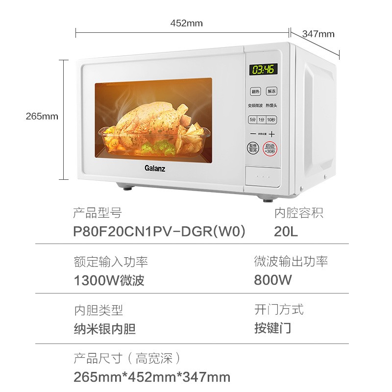 Galanz 格兰仕 P80F20CN1PV-DGR(WO) 变频微波炉 20L 精致简约智能面板,功能设置一目了然,减少繁琐按键。火候、温度,纷纷提速,800瓦大火力高效加热食材快速上桌。