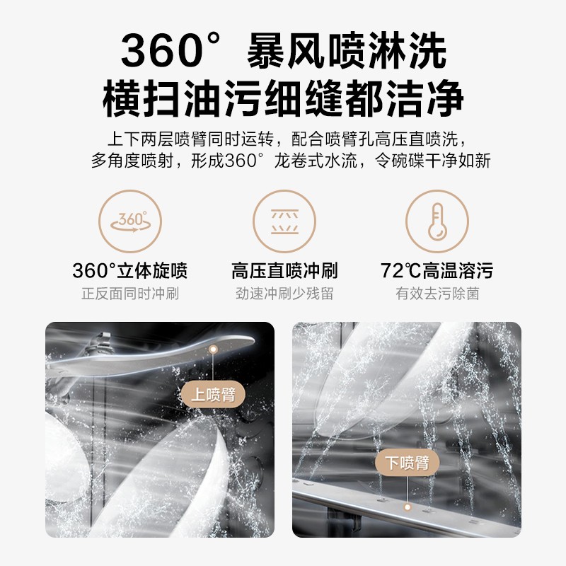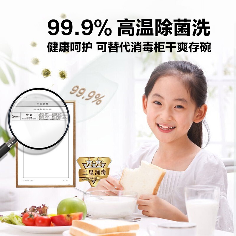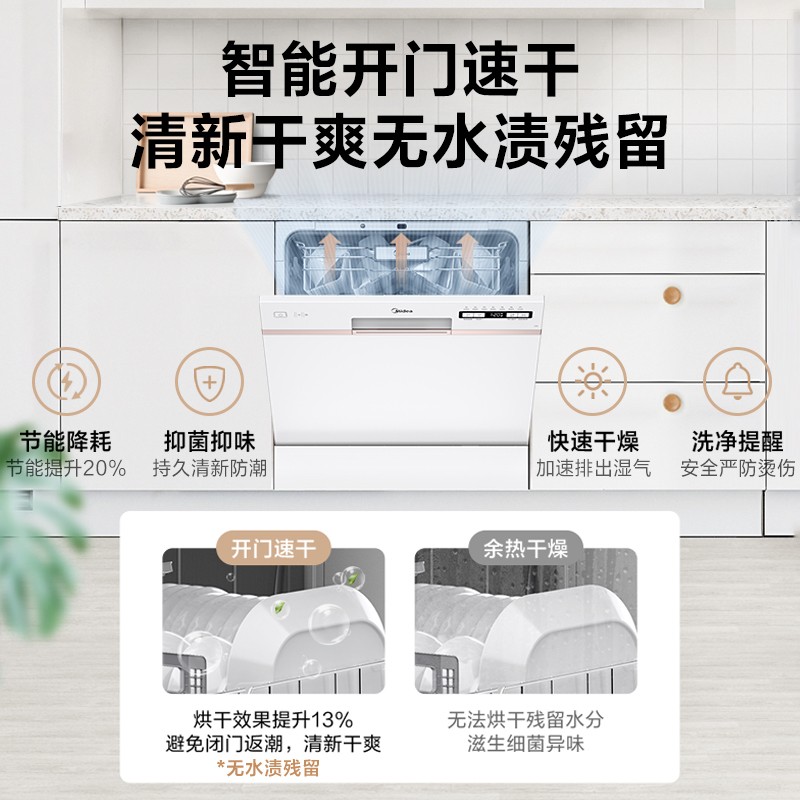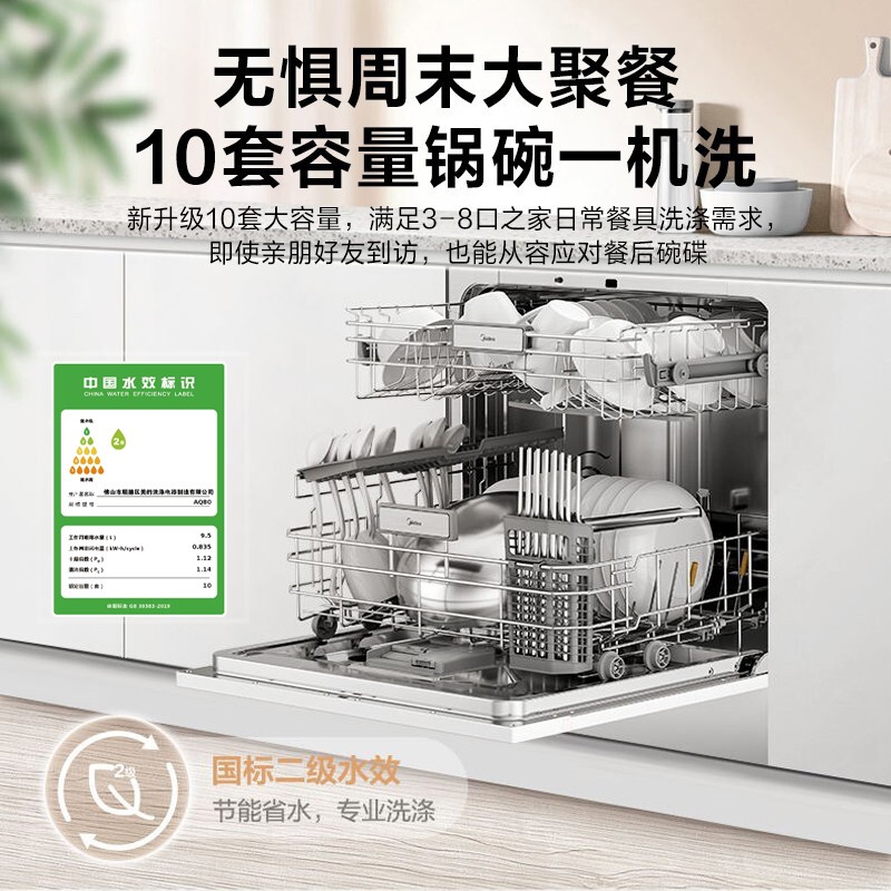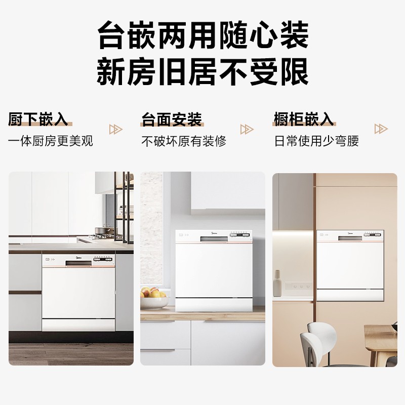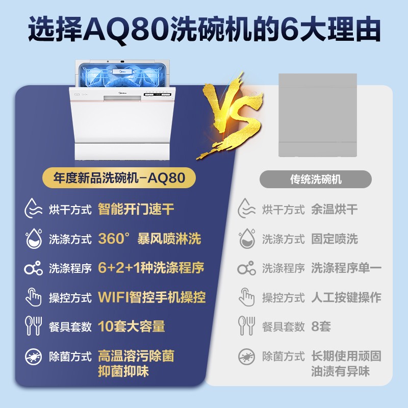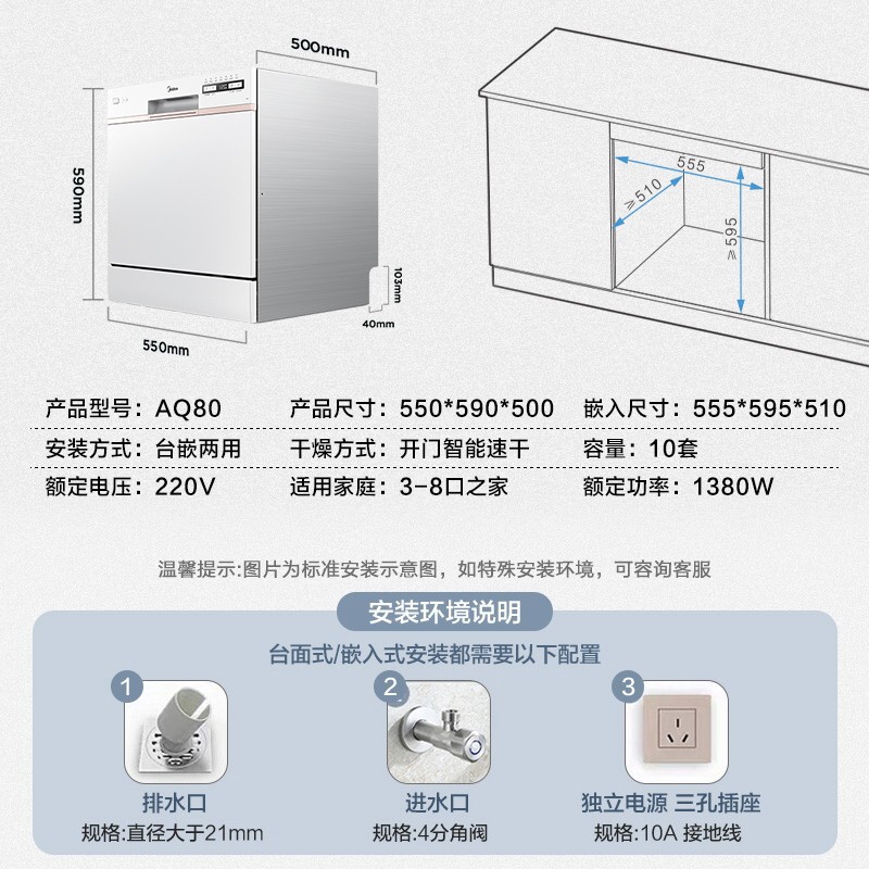 美的 AQ80 台嵌两用洗碗机具有10套容量,可选择台式摆放或嵌入式安装。具有72摄氏度高温除菌功能。全不锈钢内胆。支持自动开门,当洗涤结束后,内部气温低于50℃会自动开门排出水气。支持软水功能。支持除菌洗,果蔬洗,超强洗,快速洗等多种方式,支持手机app控制。开孔尺寸长500mm;宽550mm;高590mm。