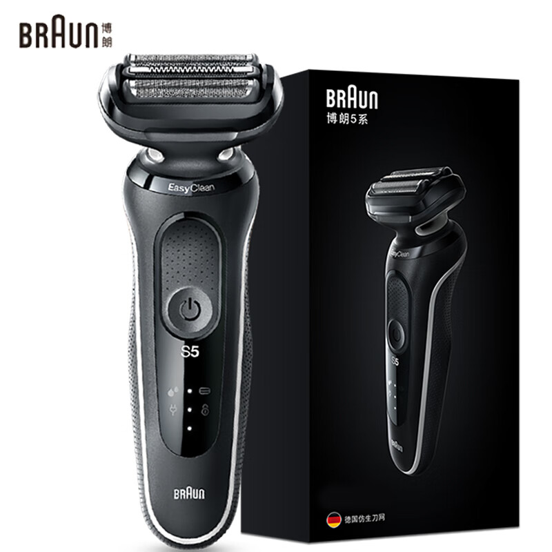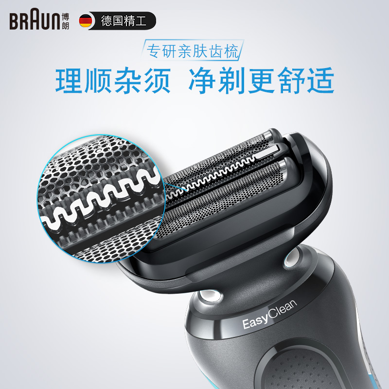 博朗 小猎豹5系列 50-W1000s 电动剃须刀采用德国OptiFoil仿生网膜,899种独特网孔,适应各种胡须,顶端精细小孔防止刮伤。进口马达动力强大,8000转每分钟,高效剃净。Easy CLEAN清洁系统,在机身颈部留孔,用水冲洗时水压通过孔洞将两侧冲洗阀冲开,仅需15秒即可将刀片清理干净。三层往复式刀头效率高的多,剃到哪里都是一遍过,省时省力。