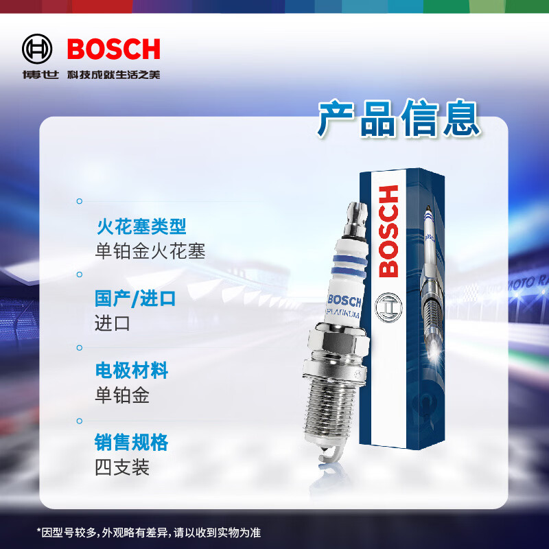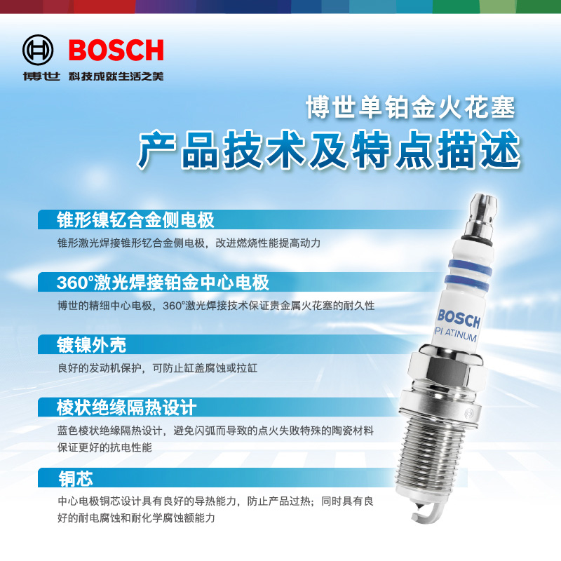 博世单铂金火花塞在中心电极含有贵金属铂金,提供强劲动力,长效稳定,使用寿命更长。