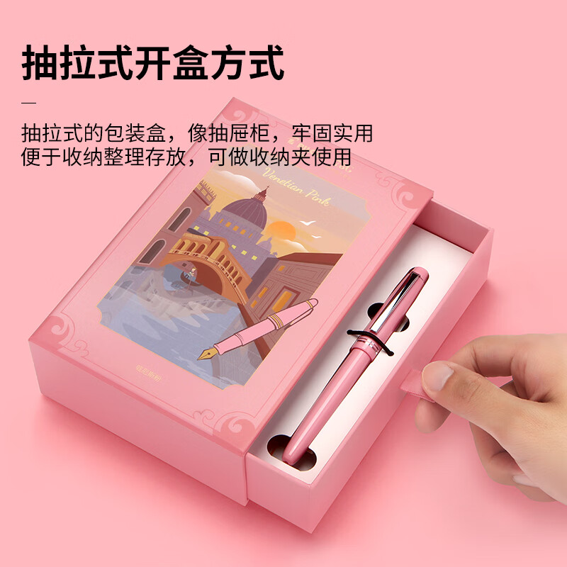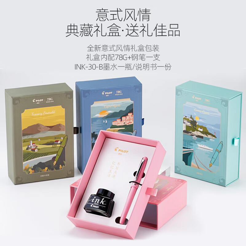 这款PILOT 百乐 意式风情系列 FP78G 新色限定款 钢笔礼盒套装,百年匠心工艺融合意式风情设计,送礼表心意,自用也相宜。封面画框与底色从意大利特色风景中吸取创意,将意式的浪漫和诗情画意镶嵌其中。贴心盒装手拉设计,花样组合时尚收纳盒,一物多用,收合自如,轻松收纳。简单的纯色设计,让钢笔凸显出时尚感简单精致,清新文艺;采用特殊合金笔尖,笔尖软弹,易出笔锋,汉字书写,顺畅而出;笔握设计,笔握贴合手指,长时间书写不易疲劳;笔杆采用树脂材质,笔身轻盈,握感舒适。