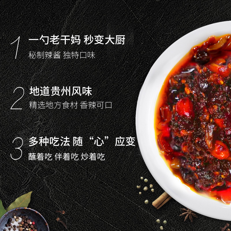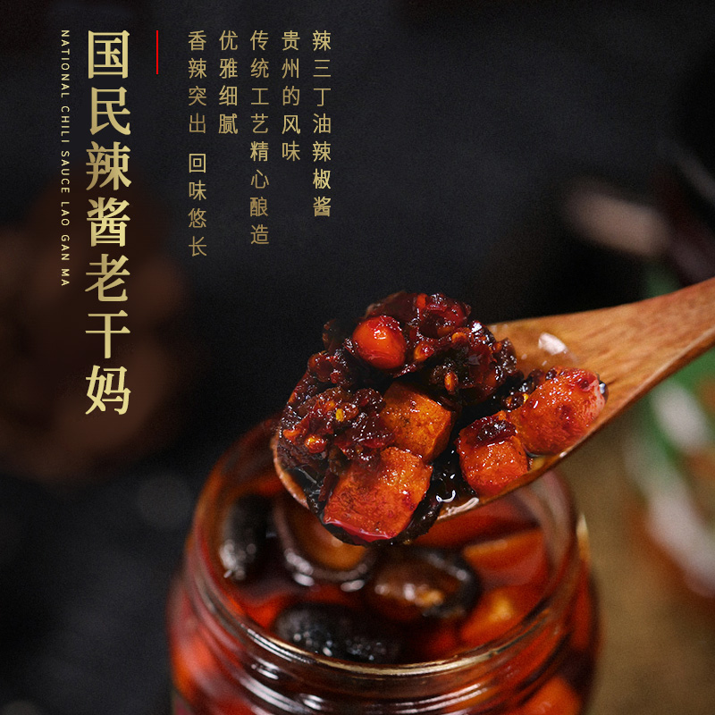 陶华碧老干妈牌是贵州的辣酱系列产品品牌,起源于1984年。主打风味豆豉、风味鸡油辣椒、香辣菜、风味腐乳等佐餐产品。此款辣三丁油辣椒香辣突出,回味悠长。适合佐餐调味,拌凉菜。配料:菜籽油、大头菜、辣椒、花生、豆腐等。规格:210g