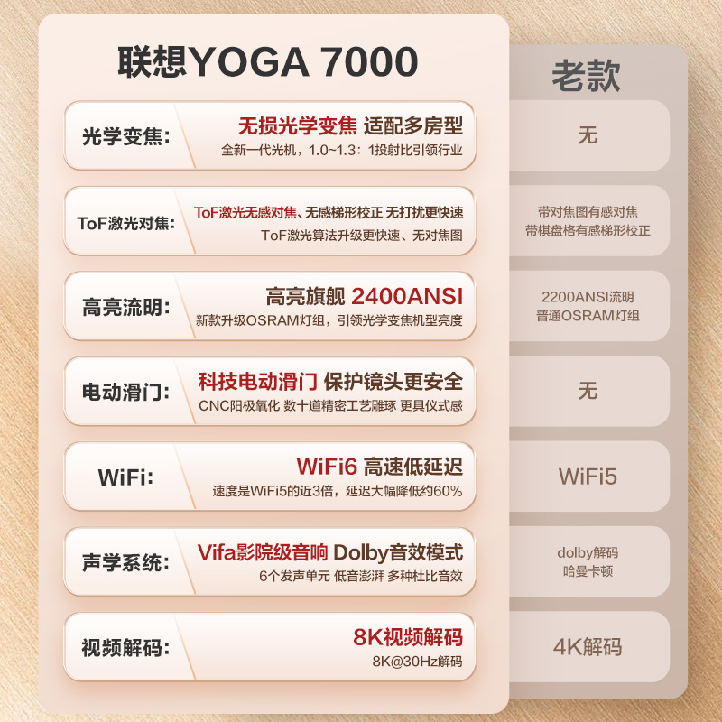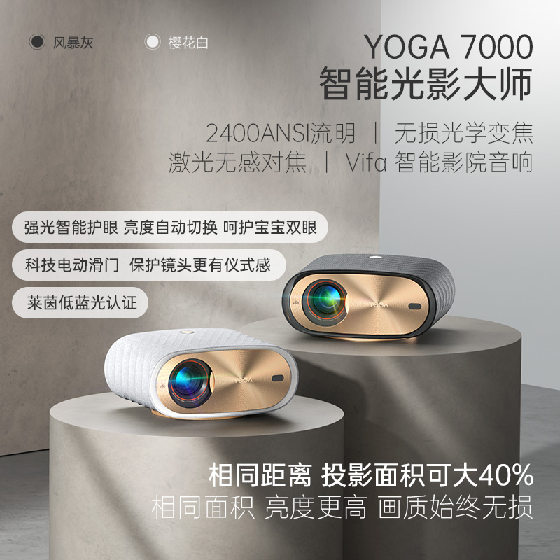 联想YOGA7000智能投影仪,新一代高品质光机,内置10片ED玻璃镜片,2400ANSI流明。光学变焦无损缩放,大小远近随需调节;1.0~1.3:1行业先锋的投射比,TI0.47’’DMD旗舰光学微镜芯片,呈现1080P高清物理分辨率;HDR10+和Hybrid Log-Gamma技术,黑白层次更分明。内置EEP智能画质引擎2.0,实时优化提升画面质量,还原专业色画效果。Amlogic旗舰级视频CPU,采用12 nm Finfet3D晶体管工艺。内置强大的NPU进行AI计算。4K MEMC全局动态补偿,丹麦Vfa影院级音响,H‖-FI智能音箱,自研深感视觉系统,融合光学变焦镜头及多组智能传感器。