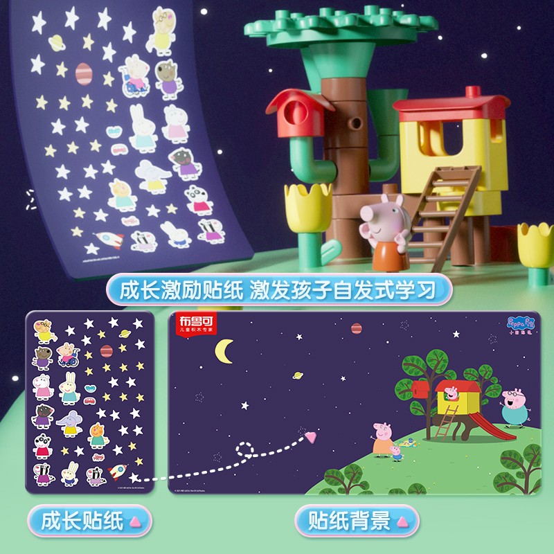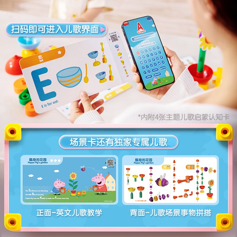 布鲁可积木小猪佩奇IP系列71006小猪佩奇ABC积木盒套组可以让孩子开动五感,集玩、看、听、说和学一体,沉浸式启蒙英语,满足不同阶段孩子早教学习英语的需求。孩子动动小手即可还原《小猪佩奇》动画同款场景,锻炼宝宝的动手能力和认知能力。套组内含有字母卡片,每张卡片对应一个动画造型,宝宝除了可以按照卡片进行拼搭之外,还能够学习英语字母和单词,家长还可以使用APP扫码,为孩子播放英语儿歌,寓教于乐。