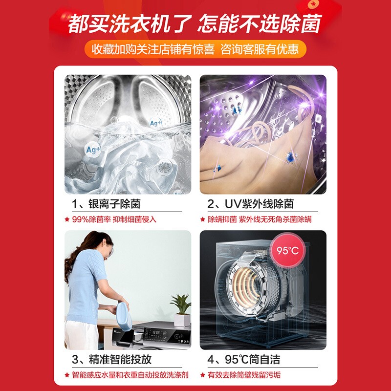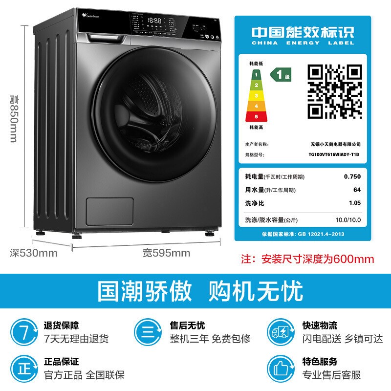 这款小天鹅(LittleSwan)型号为TG100VT616WIADY-T1B的10公斤滚筒洗衣机,采用活性银离子全时巡航主动除菌,除菌率达99.99%,经紫外线光照形成保护膜,达到48h长效抑菌保护。还采用I-Smart智能投放洗涤剂,是通过自动感应衣重和水量,智能匹配洗涤剂用量减少化学成分残留,衣服干净又健康。内置BLDC变频电机,运行噪音在52分贝左右。ACP抗菌门封圈,抗菌率高达99.99%,防止发霉滋生细菌。控板8°倾斜,轻松操作不弯腰,还配备安心童锁,防止宝宝误操作。内置筒灯避免漏拿衣物。95℃高温筒自洁,防止洗衣二次污染,还洗衣洁净空间。