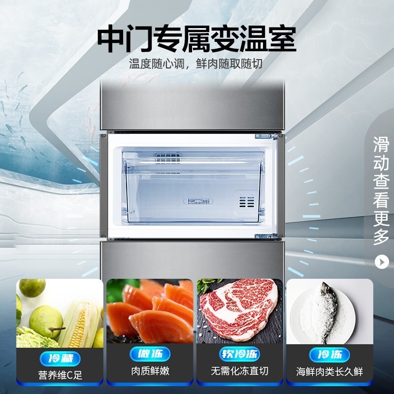 这款冰箱采用三温三控设计,智能控温,速冷速冻,强冷保鲜,满足你的不同需求。时尚的星际银外观,适合多种家居搭配。磨砂质感面板,耐磨损,易清洁。