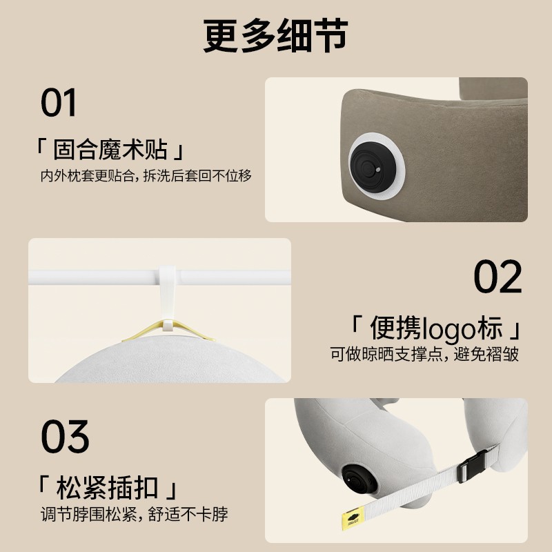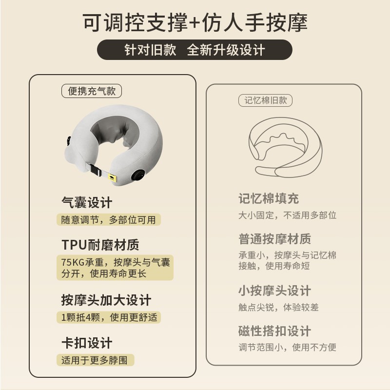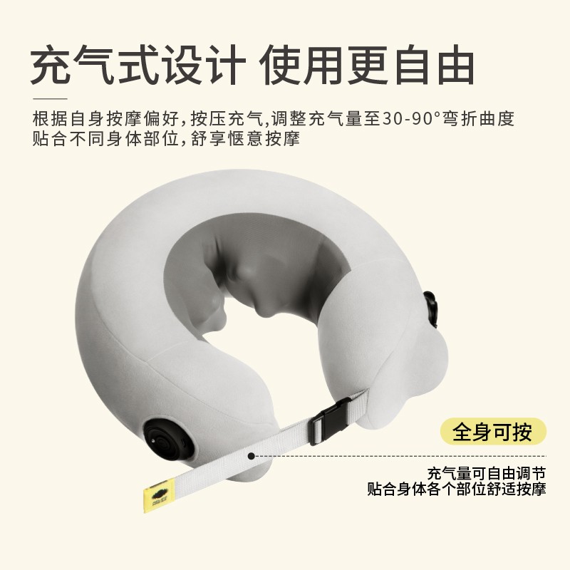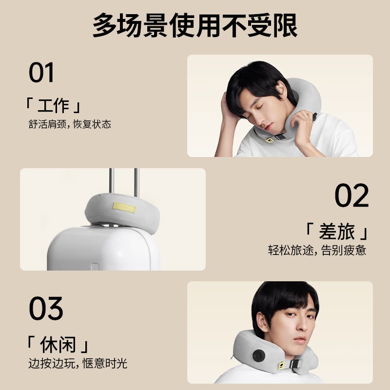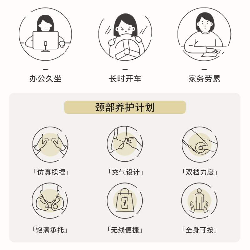 内置圆润3D按摩触头, 高低有序,轻重有度,如同手指般环绕式旋转揉捏,体感更舒适,人体工学C型流线设计,环绕支撑, 贴合颈椎曲线,无缝托扶,让按摩更舒服。