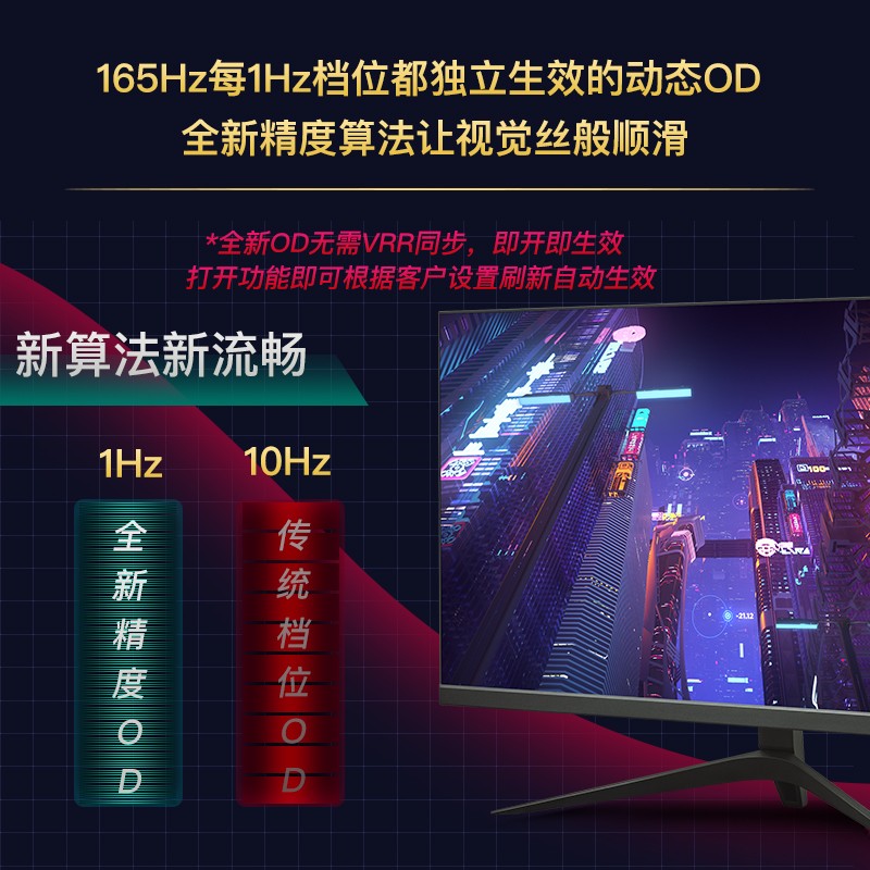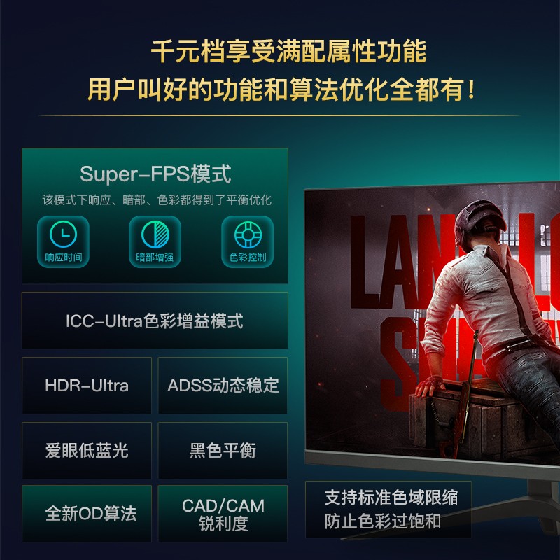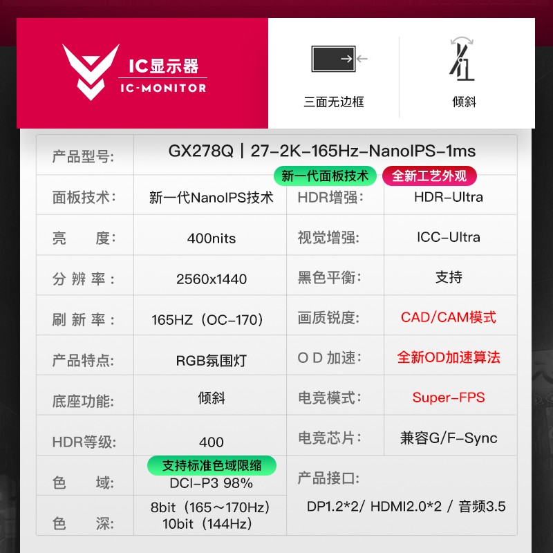 GX278Q新品升级,采用 27 英寸 IPS 显示屏,27英寸2K-170Hz-IPS快速液晶显示屏,全新优化算法OD加速功能,采用原厂400亮度IPS面板,其中支持HDR-400亮度,同时拥有sRGB-99%的色域覆盖,并且支持HDR-Ultra,三面窄边框,具有ICC-Ultra无损灰阶色彩增强,支持暗部增强,告别死黑,支持ADSS高级动态稳定。