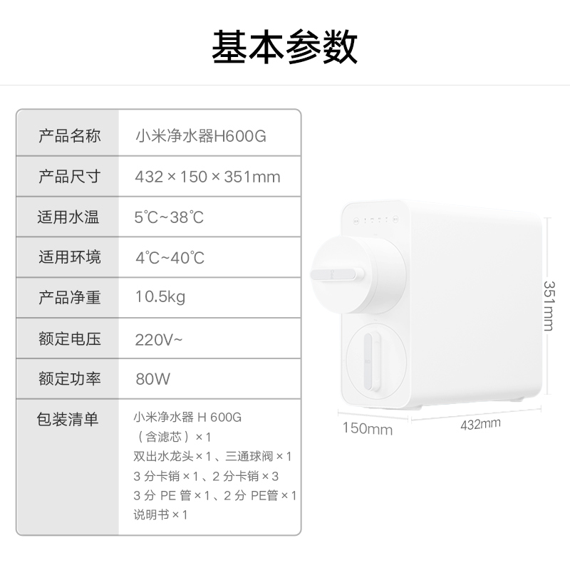 小米净水器H600G采用RO反渗透过滤,无罐设计即滤即饮,防止二次污染。具有600G大通量RO膜,出水速度可达1.58L/min,用水无需久等;采用新型复合滤芯,在两根滤芯中融合了六级过滤,改善了饮用水口感;同时配比更加合理,减少滤芯更换次数,两年仅需更换3只滤芯;H600G的纯水废水比最高可达2:1,达到国家最高标准一级水效,减少浪费,综合净水成本仅需0.24元/L。