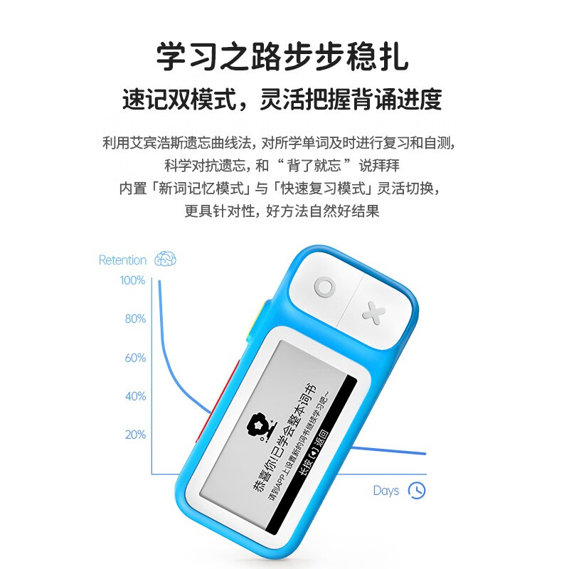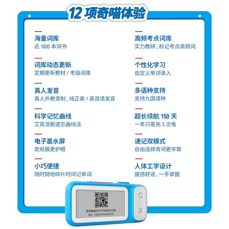 续航方面,一年只充3次电,充电一次可用150天。续航再升级提升50%,无需息屏,拿起就能背词。