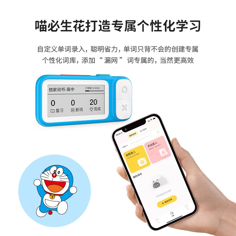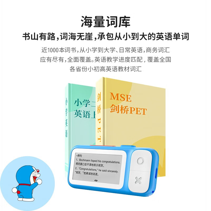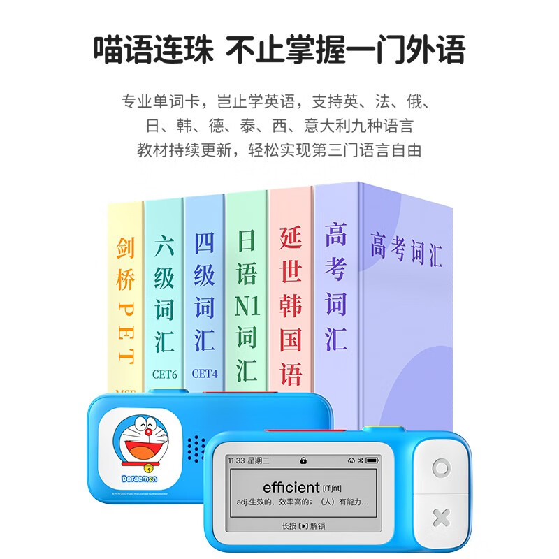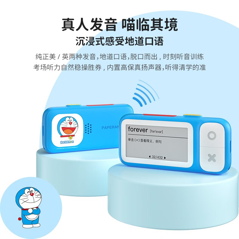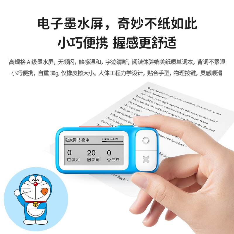 喵喵机 E2 电子单词卡,此款与哆啦A梦共同联名,外观小巧可爱。依旧采用电子墨水屏,文字显示堪比激光刻印,阅读体验媲美纸质图书;高规格α级墨水屏,无频闪,背单词不累眼。