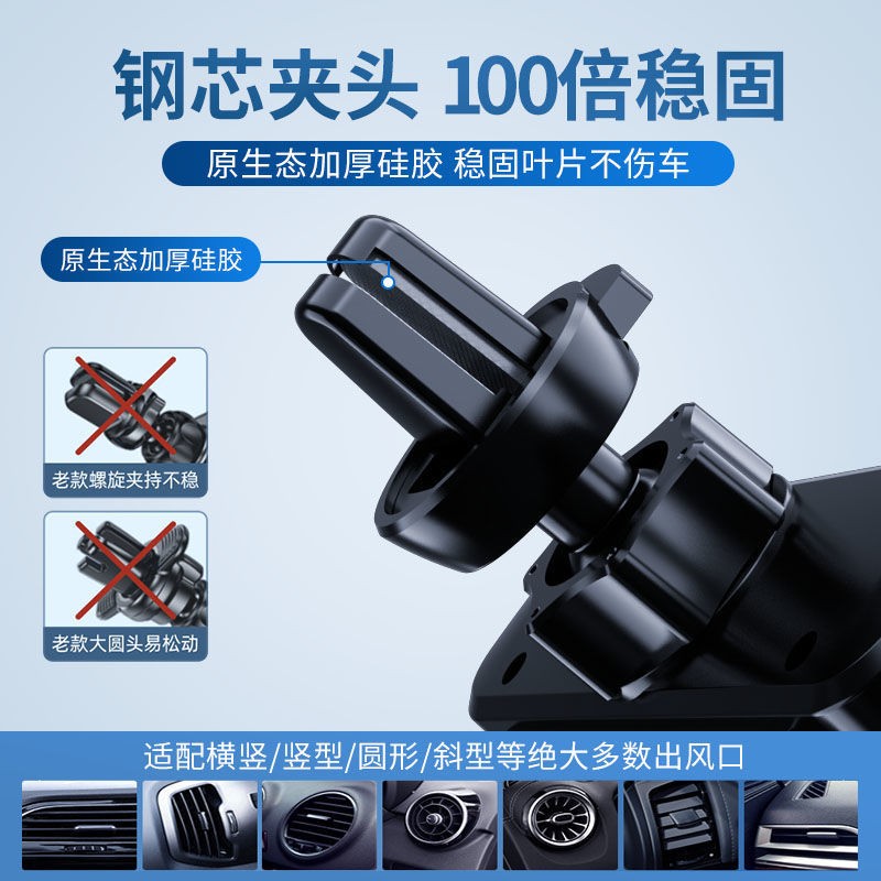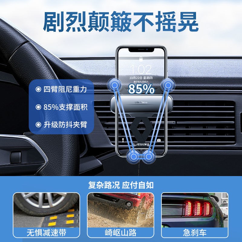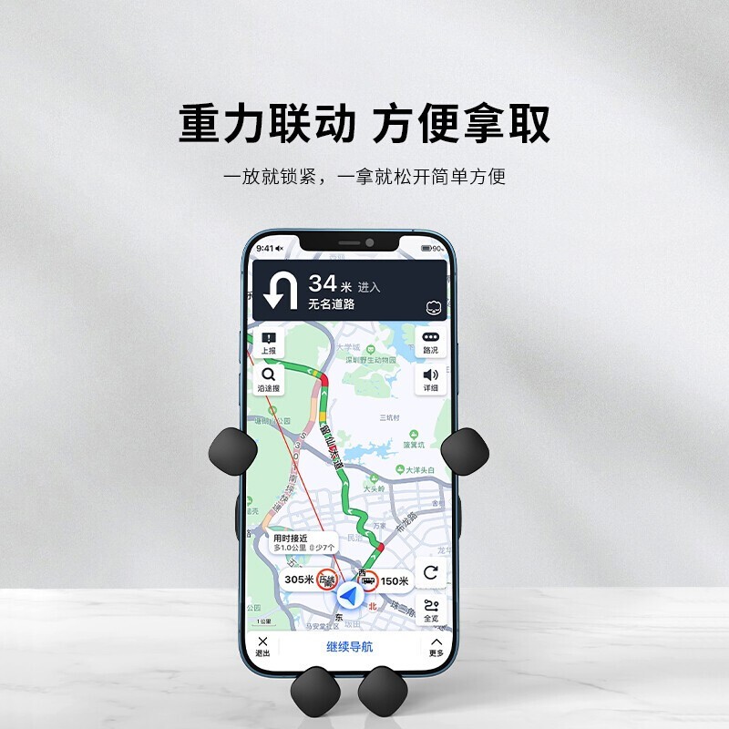 金属喷砂工艺不掉色更耐用,三十二道精细工艺,不掉色,更耐用质感和实用性的双向提升,一秒取放单手操作,更省力的伸缩结构,减少摩擦阻力,单手轻松取放,安全导航,在不放置手机的情况下,支架自动收起放置手机后,支架自动展开锁紧手机。
