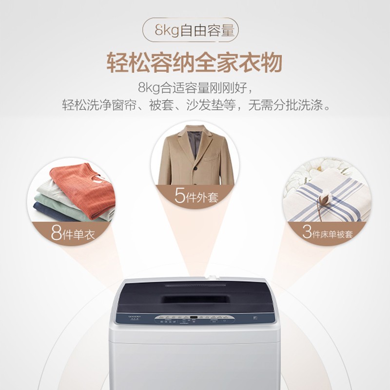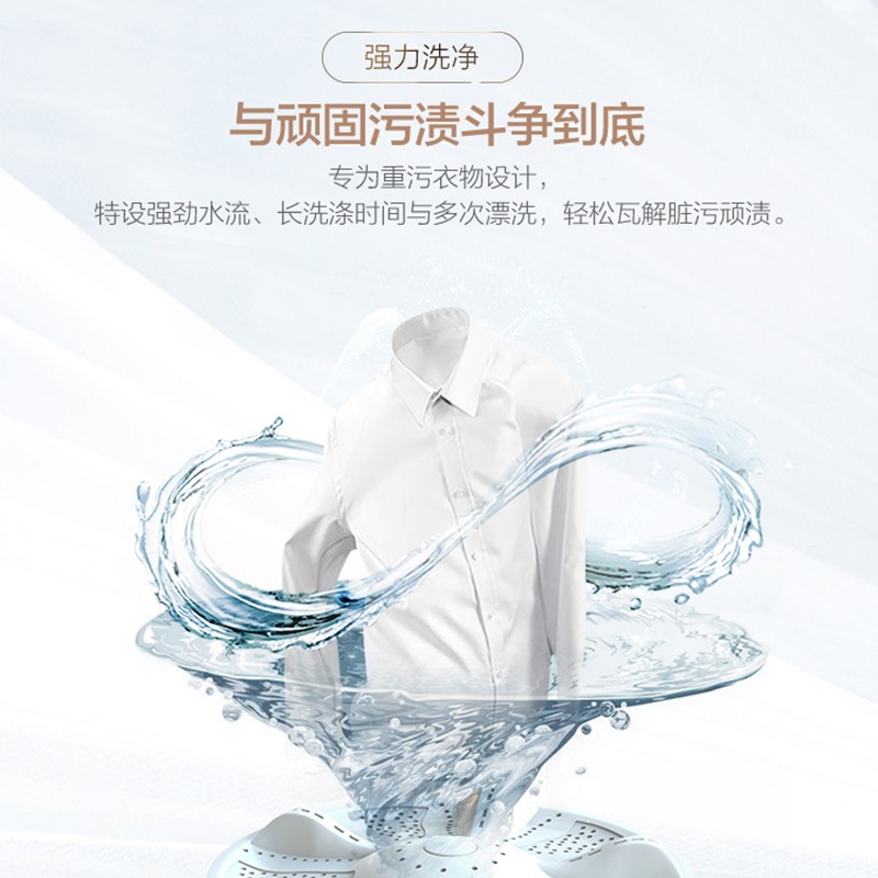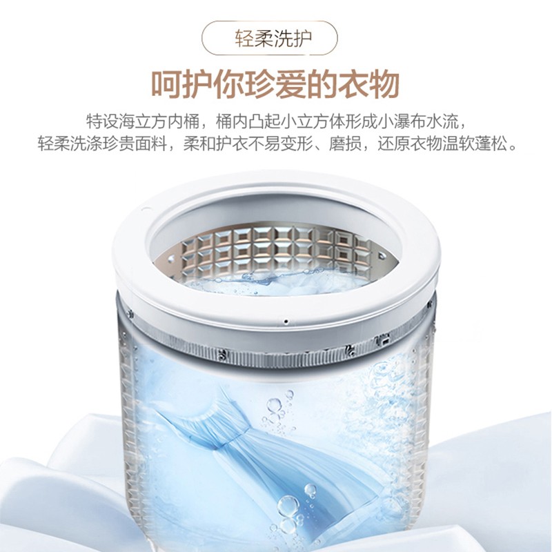 特设海立方内桶,桶内凸起小立方体形成小瀑布水流, 轻柔洗涤珍贵面料,柔和护衣不易变形、磨损,还原衣物温软蓬松。特设强劲水流、长洗涤时间与多次漂洗,轻松瓦解脏污顽渍。智能感知衣物重量,自动按需调节洗衣用水量 洗衣更简单,省水更节能。在电压不稳和水压较低条件下, 洗衣机可智能自调节,一如往常启动、运行。简约风,百搭多样家装风格; 小巧纤细身段,充分利用每一寸空间,匠心设计更少占地。桶自洁清洁内外桶间残留污垢,防止衣物受到二次污染; 桶干燥有效干燥内外桶壁,防止内桶潮湿发霉。