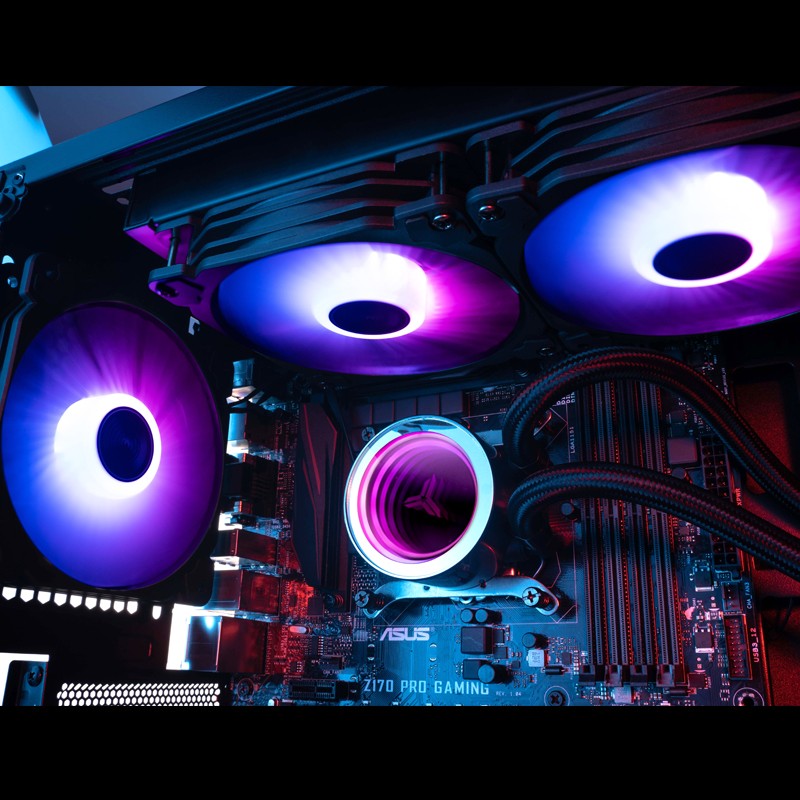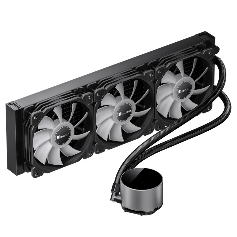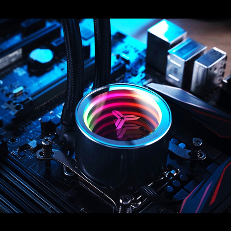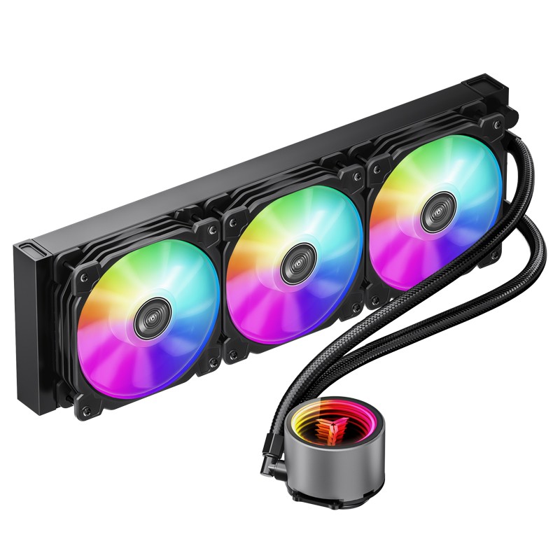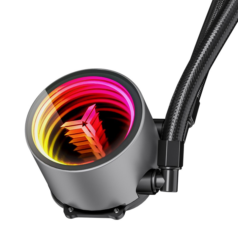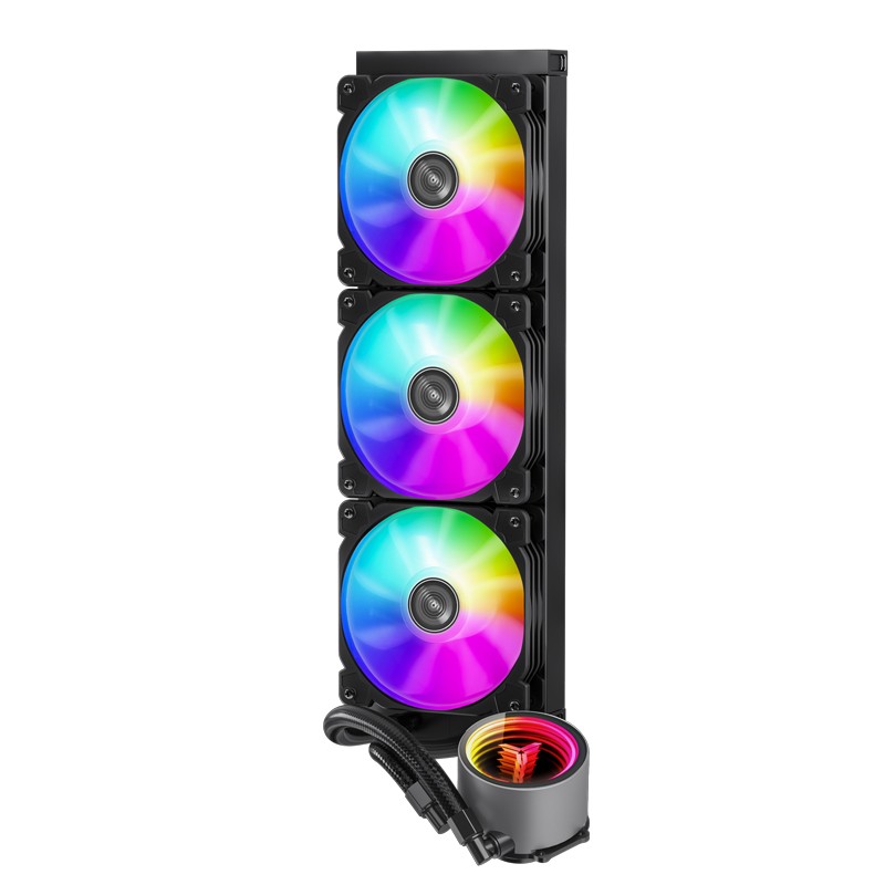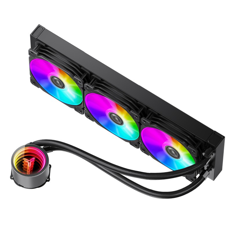 铝合金外壳,纯铜底座,90片鳍片,120cm^2散热面积渭水道,7叶转子,12颗灯珠+柔光灯环+LOGO指示灯,镜面玻璃视窗。高压加固接口,EPDM+IIR高密度聚乙烯共混物水管,高分子纤维蛇网。密集波状鳍片,14条热交换流道。支持AMD、Intel平台,配备ARGB遥控器,三年质保。