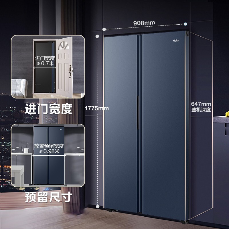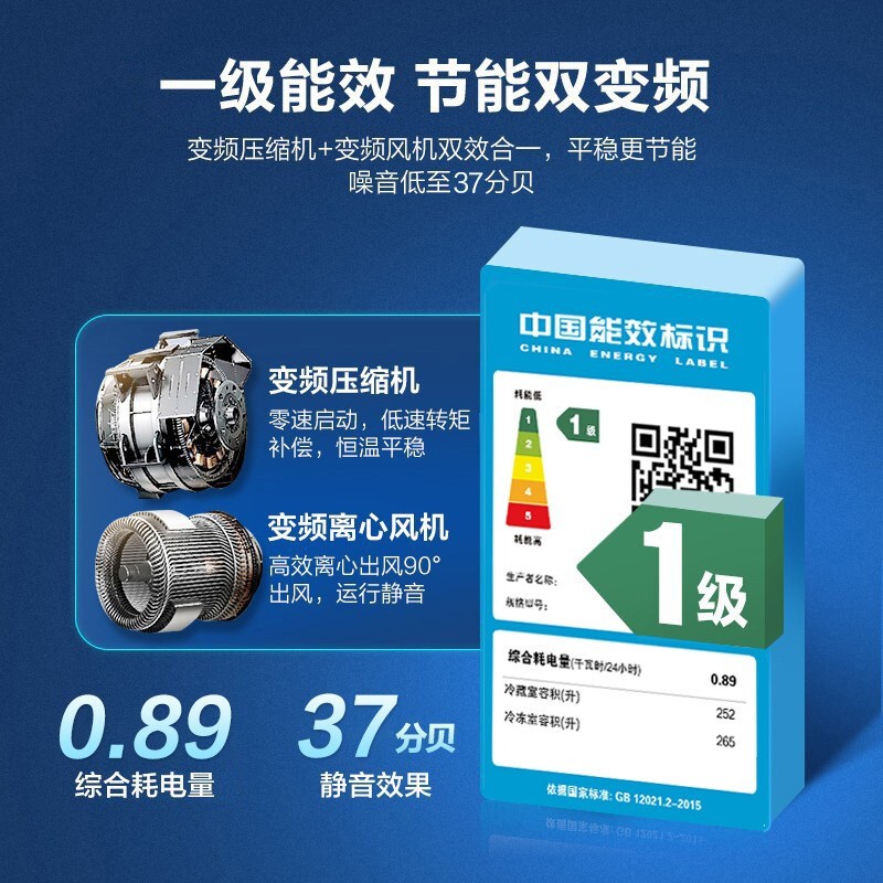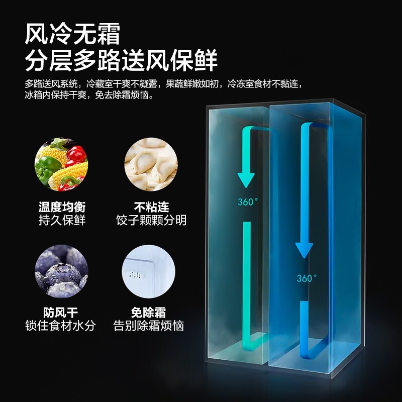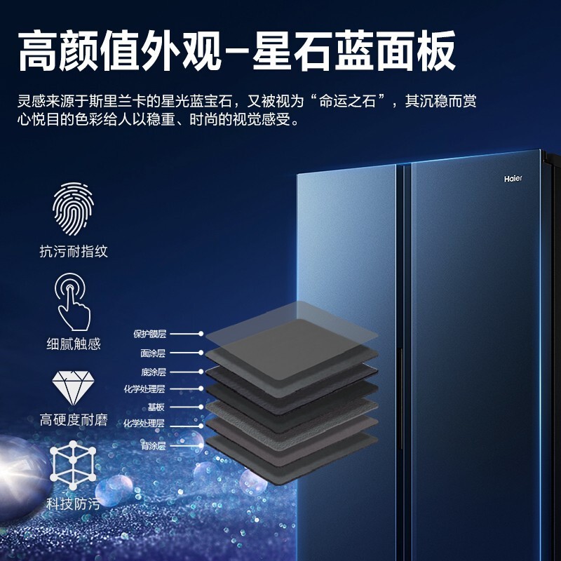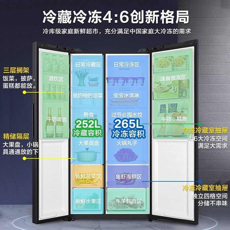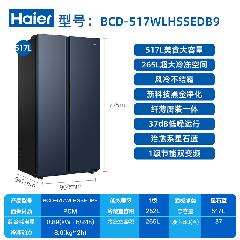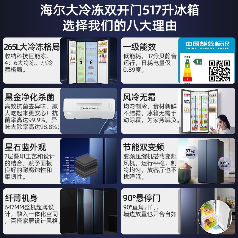 Haier海尔BCD-517WLHSSEDB9双变频冰箱是22年最新上市的一级双变频大容积冰箱,一级双变频:变频压缩机+变频风机,一天不到一度电,制冷更快、节能静音; 分层多路送风:采用精控传感器,配合冷藏、冷冻多出风口,温度均匀,波动性小;黑金净化:有效吸附清洁冰箱内的气味,全面呵护食材健康、守护食材原鲜口感; 风冷无霜:采用风冷控制系统,免除除霜烦恼; 90°开门悬停:门体打开至90°,抽屉可无障碍抽取,门体可自动悬停,释放双手; 265L大冷冻:打破常规储鲜,远超常规冷柜,相当于为家再添一个小冷柜; 舒心品质:柔和光线不刺眼,人体工学把手更开合省力等等小细节。