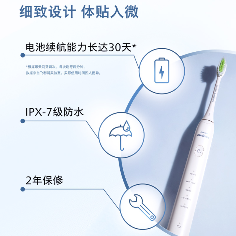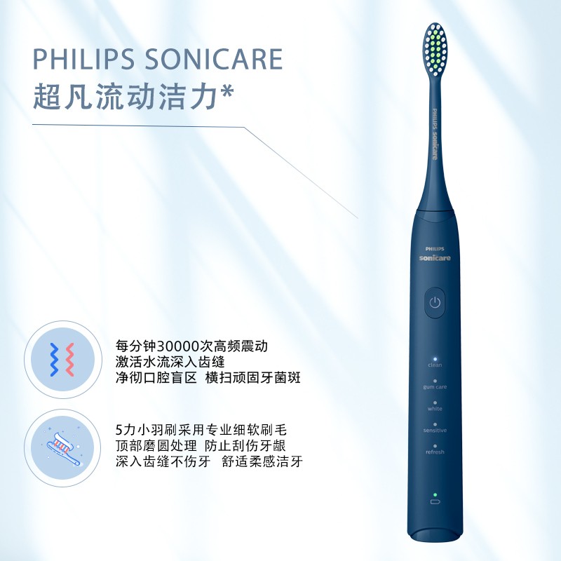 有清洁、亮白、护龈、敏感、清新五种模式,每分钟30000次声波震动, 续航长达30天哦,全新“清新”模式可以有效去除口气,解锁自信气场 采用的是柔和型亮白刷头,磁悬浮脉冲马达,2分钟智能计时,30秒换区提醒