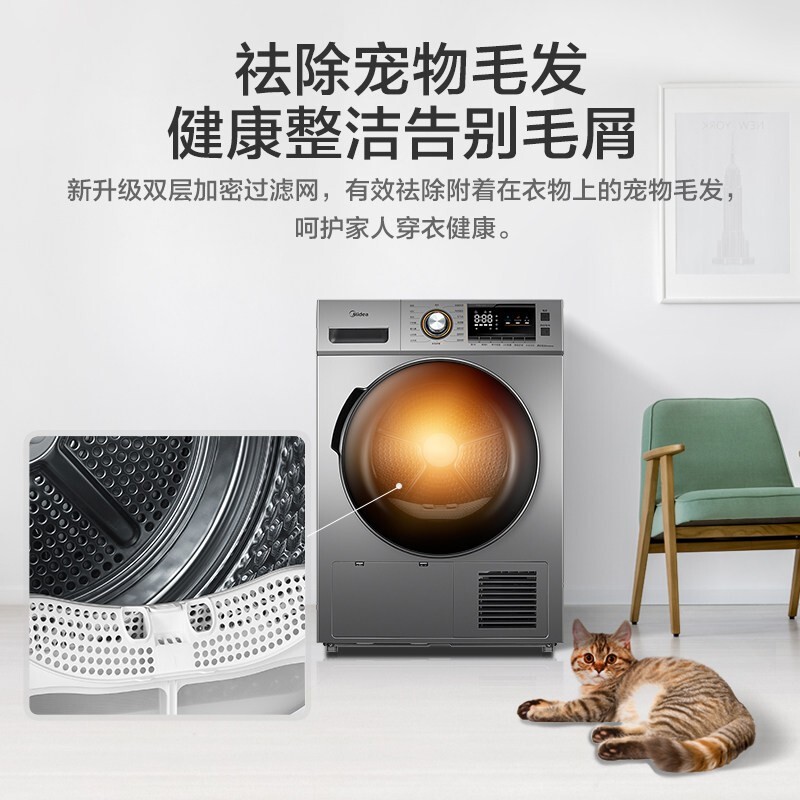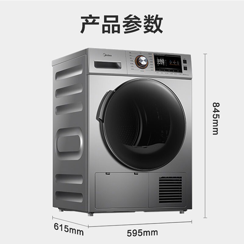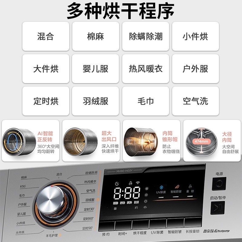 美的(Midea)这款型号为MH90-H03Y的干衣机,采用了节能高效的热泵式烘干,烘干容量9公斤,配备有多达9种烘干模式,满足多样使用需求。内置UV杀菌灯,搭配不锈钢内筒的镜面反射,可达到对内桶衣物99.9%的除菌。配备有双重毛线过滤网,以避免毛屑进入冷凝器,影响烘干能力。配备有温湿智能传感器,实现衣干即停,避免过度烘干,具备AI智能正反转,有效避免衣物缠绕。