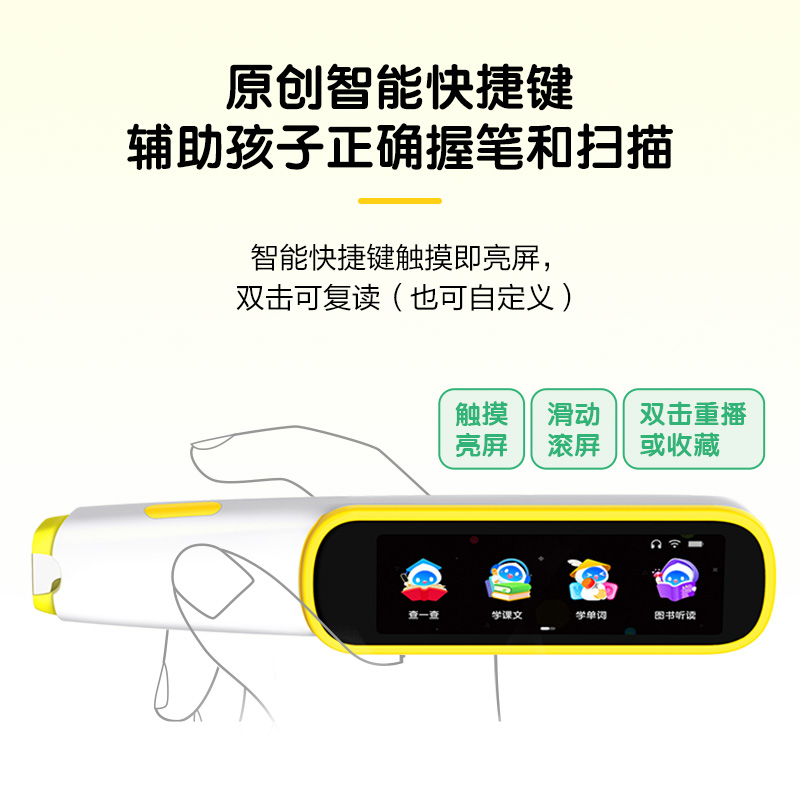 采用糖果色撞色的可爱外形,贴合孩子的童趣审美,使用2.99英寸高清触摸屏,按住语音键随心说随时译,中英文自动识别。OCR智能矫正算法,可实现20°~90°扫描角度自适应。扫描头补光灯采用聚光设计,光照处即取词范围,直观高效,取词精准。原创智能快捷键,握笔时自然触摸辅助键即可亮屏,双击可复读,单手操作更便捷。