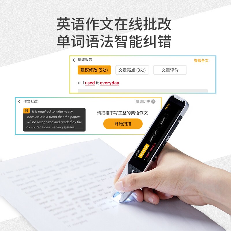 突破性整段翻译+讲解,AI老师实时批改作文,需要修改的单词、语法一一列出,同时附带批注,让学生明白错误出在哪里。另外还会对作文进行打分,鼓励学生。AI老师批改记录可保留,一份随时可查阅的错题记录,学习成长有迹可循。