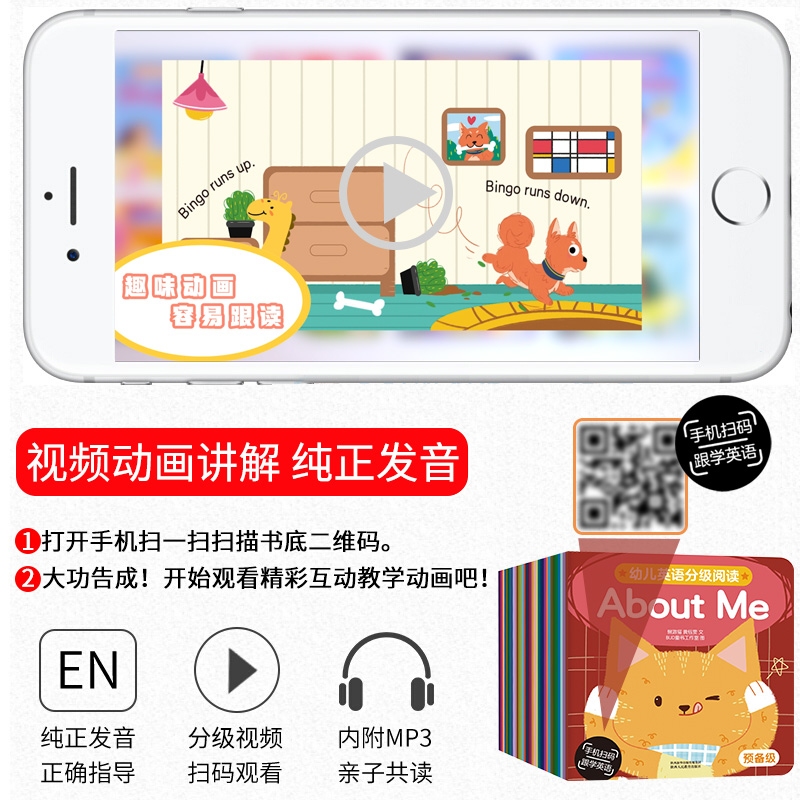 这套书场景均来自日常生活,画面轻松活泼,贴近日常生活,篇幅短小,但内容详实,让孩子学会常见事物的英语表达,甚至能用简单的语句表达自己。随书配有动画视频,小朋友自己录音,符合小朋友的说话语气,让小朋友更有代入感,也更易跟读、模仿,锻炼小朋友的口语表达能力。