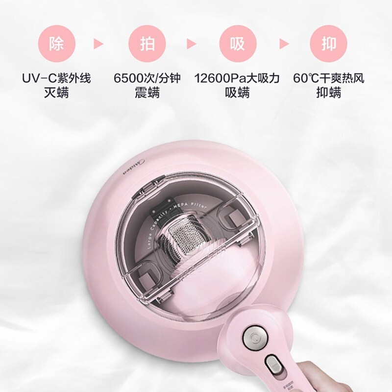 机身小巧轻便,重量仅1.3KG,带有UV-C紫外线杀菌灯,可有效杀灭床褥表面的细菌和螨虫。支持热敷除螨功能,当抬起机身时,紫外线灯自动关闭。300w功率电机配合7000次/分钟的拍打,10000PA大吸力,吸走从被褥中震荡出的灰尘和螨虫。尼龙网+海帕滤芯的双重过滤系统,净化通过的空气,过滤片可水洗,最大噪音小于62.5dB。