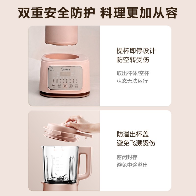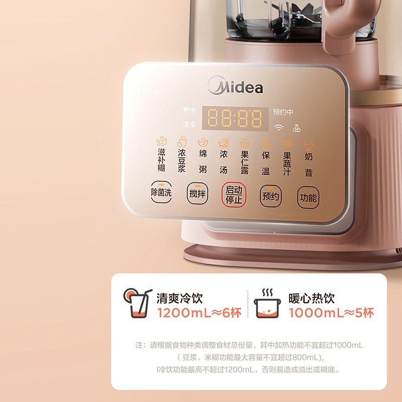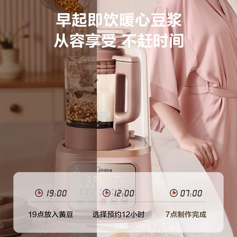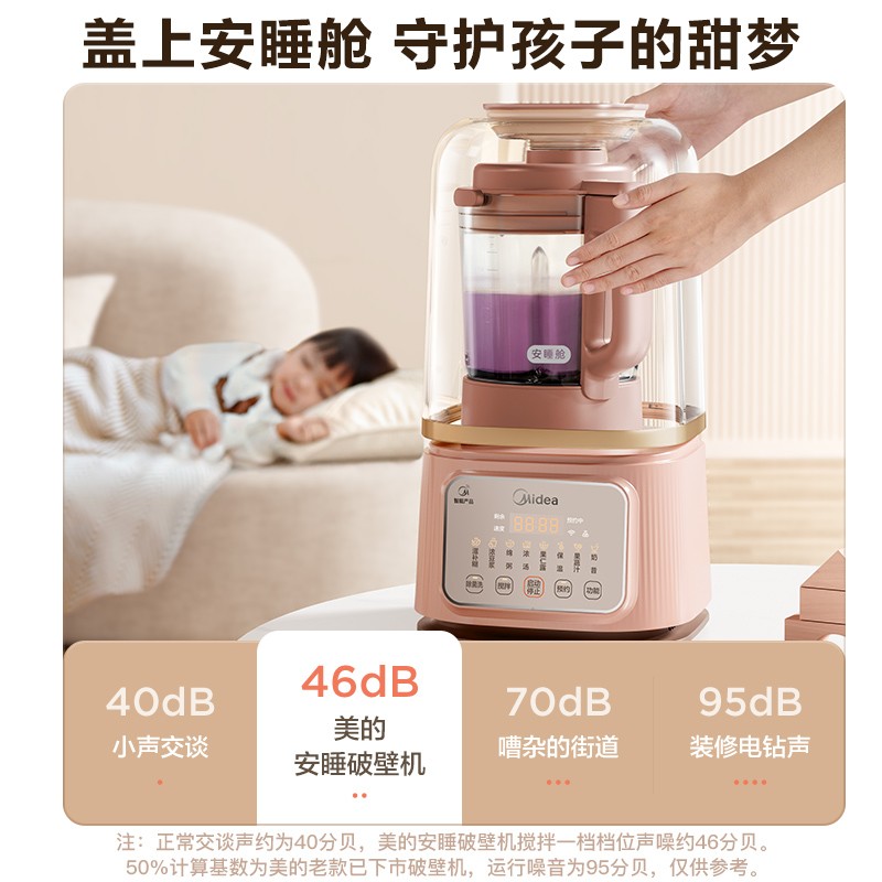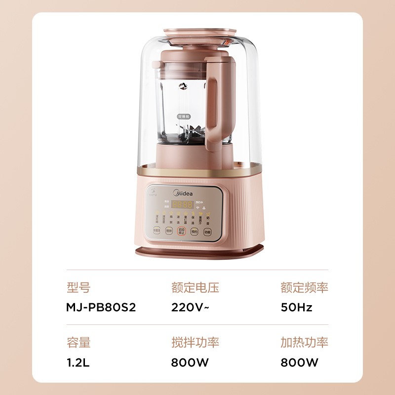 美的 MJ-PB80S2 破壁机,WIF互联智能预约,采用升级陶瓷不沾底盘,隔音罩包裹,加厚物理隔音降噪,360°真实物理消噪,隔绝噪音,声音低至52分贝,800W大马力,12小时预约。