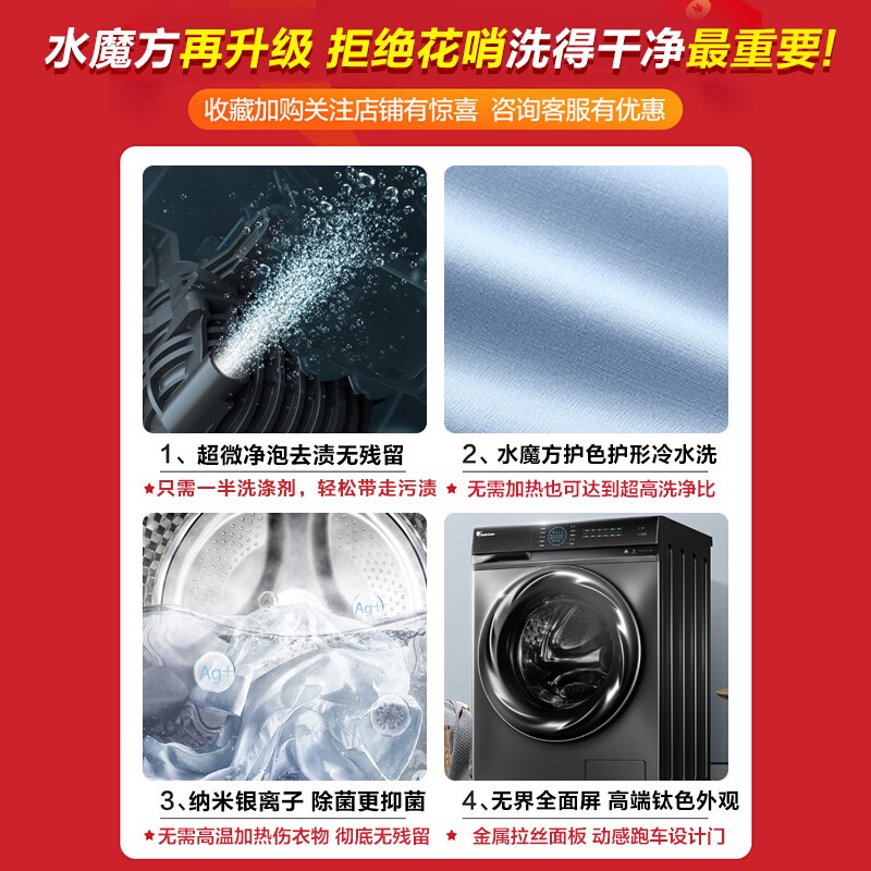 小天鹅洗衣机物理去渍更健康,超微净泡洗,水魔方冷水洗,3D立方内筒,纳米银离子除菌,快舒省蒸汽烘干,超跑外观设计,专利超微净泡引擎产生亿万小汽泡,深入衣物纤维,物理去渍无残留,超微净泡引擎,通过亿万小汽泡深层清洁油污,无需洗涤剂即可去除油污,冷水洗涤不加热,通过变幻三大水流强力洗浄衣物,深层瓦解污渍,更有效保护衣服不变形不褪色,立体凹凸造型,模拟搓衣板洗衣过程,搭配魔力提升筋,增加摔打力度,有效剥离污垢,纳米银离子除菌,净衣抑菌更健康,10kg大容量全家衣物一次搞定。