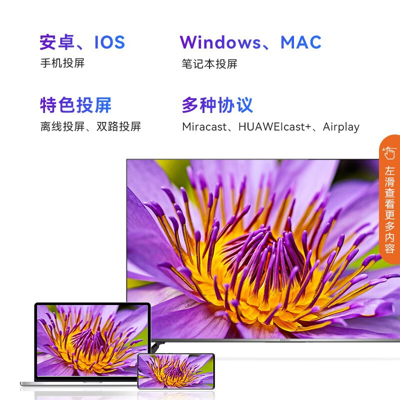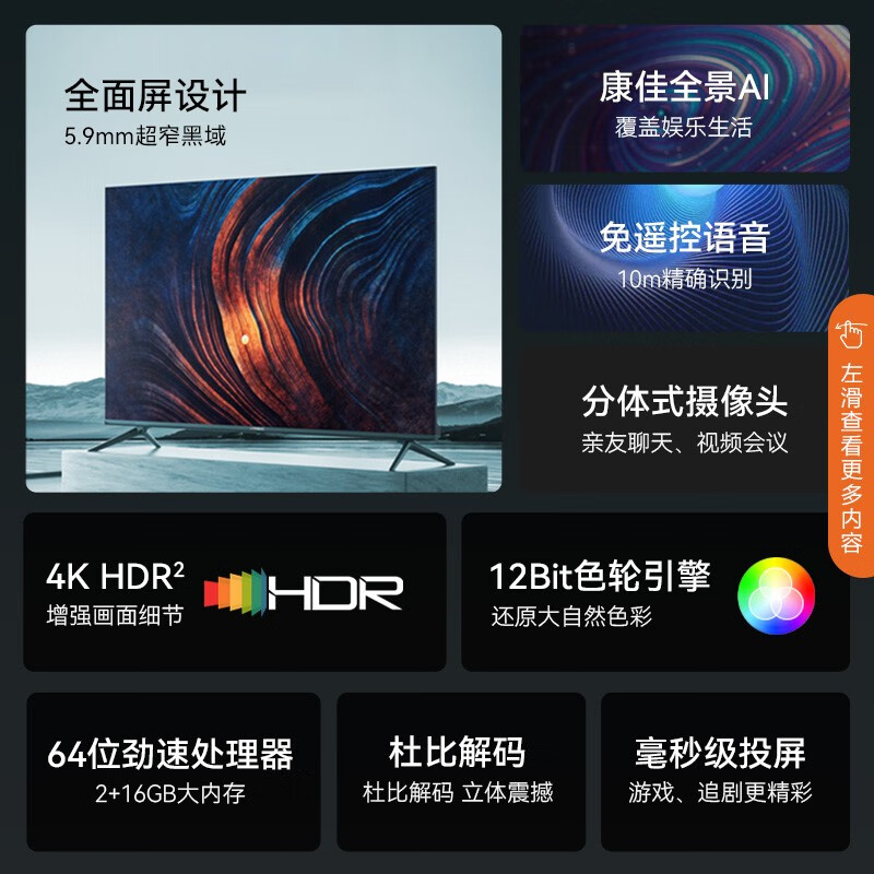 康佳 65G5U 液晶电视 65英寸采用全面屏设计,拥有超高屏占比;四核A53架构CPU,2GB内存+16GB闪存;12米超远距离的免遥控AI智能语音,4K高清分辨率+12Bit的色轮引擎还原更真实的画质体验,以及包含HDMI、USB、SPIDF等超丰富的接口。