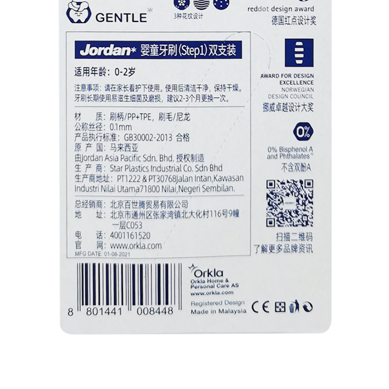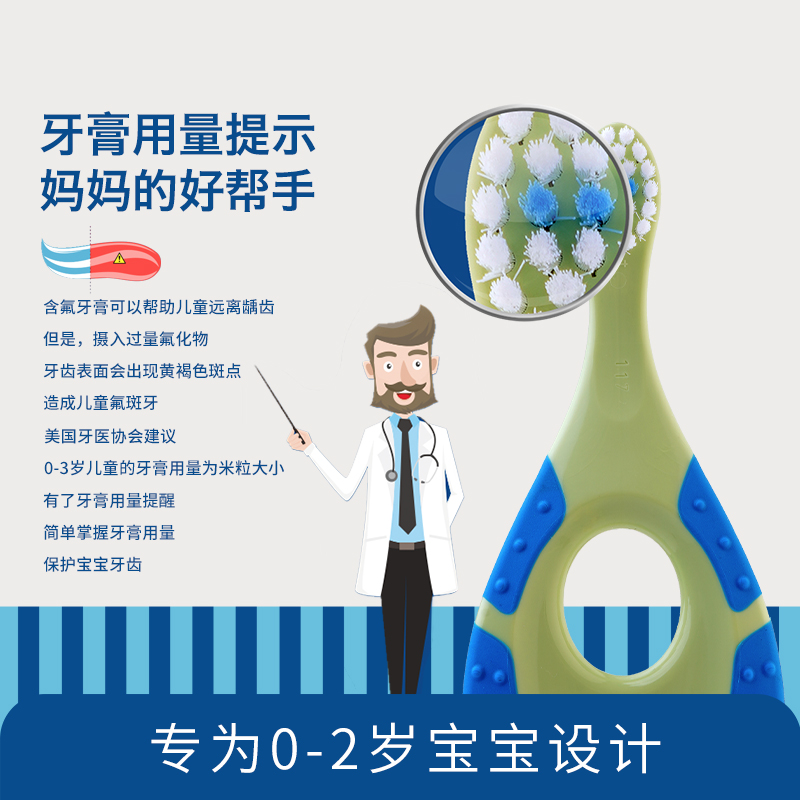 源自挪威进口,高密度优质杜邦丝软毛,有效清洁的同时保护宝宝幼嫩口腔。科学的牙膏指示量,避免用量过多损害宝宝口腔黏膜,大环形短手柄,避免戳伤宝宝喉咙。手柄还可当磨牙棒使用~