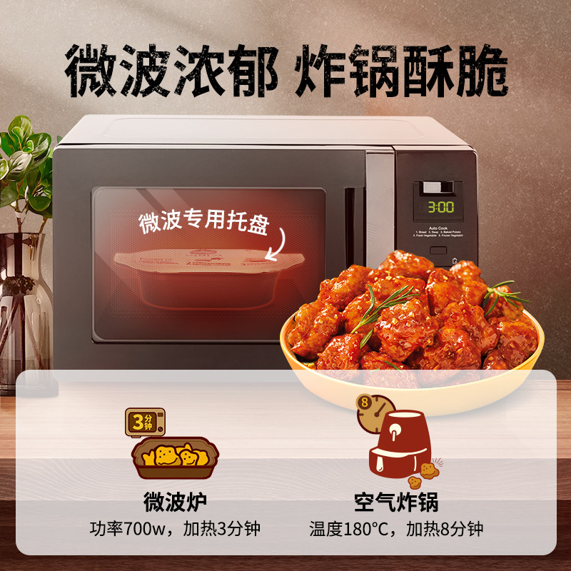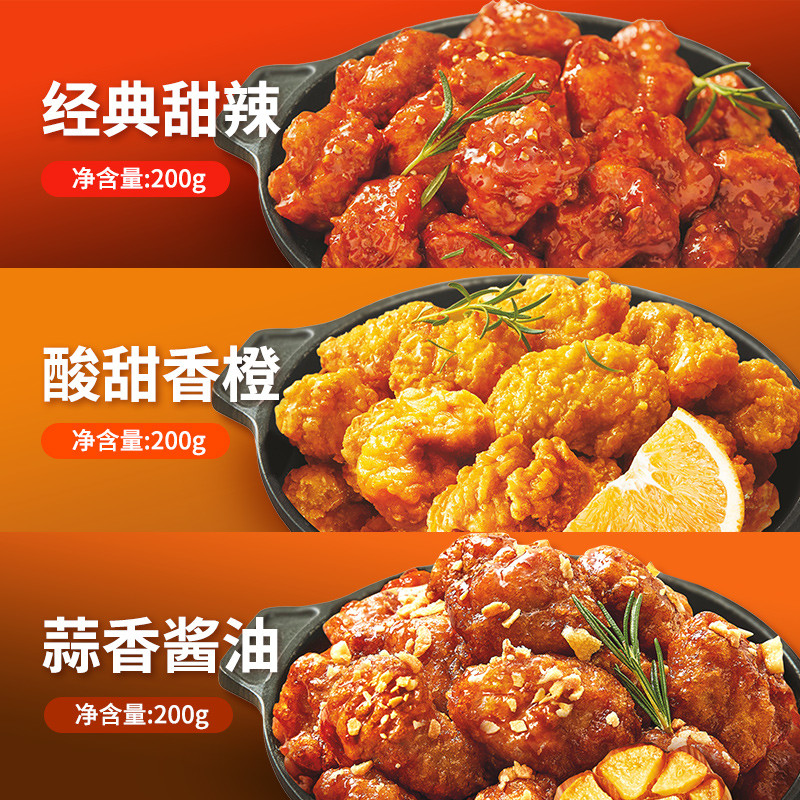 经典韩式炸鸡,方便快捷,适用于微波炉、空气炸锅、平底锅烹饪,微波三分钟即可享用。经典甜辣甜微辣味交织,鲜香吮指,酸甜橙香清新可口,酸甜交错,口口炸鸡香。规格:200g*7。