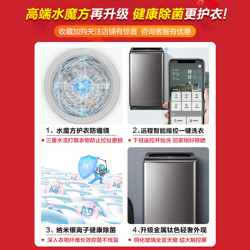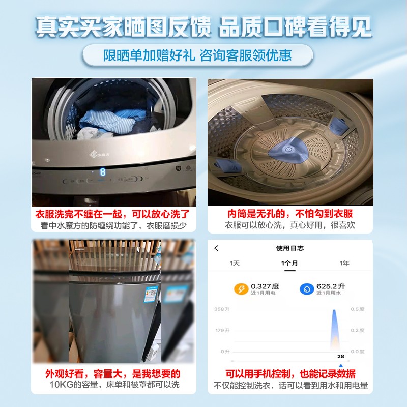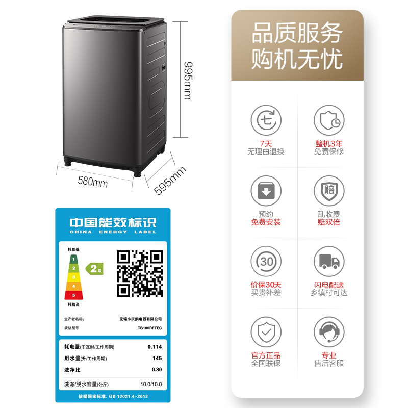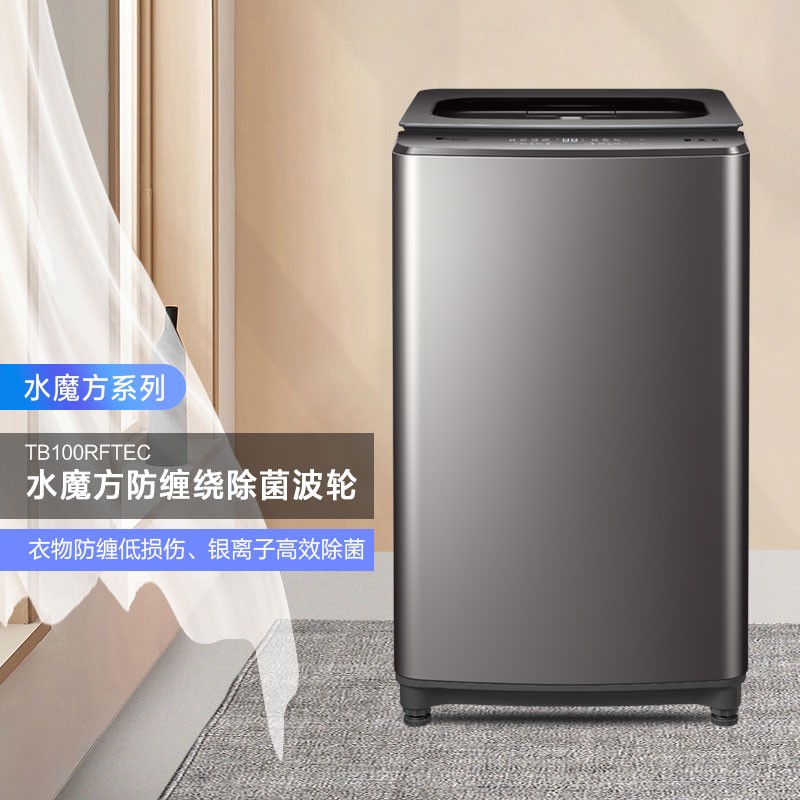 小天鹅 水魔方系列波轮洗衣机TB100RFTEC,防缠绕功能,带有纳米银离子除菌,内筒带有特殊的无孔设计,有效降低磨损,避免衣物磨损。10公斤大容量,可洗床单被套。支持深层除螨。采用下排水方式,机身尺寸为580*595*995。