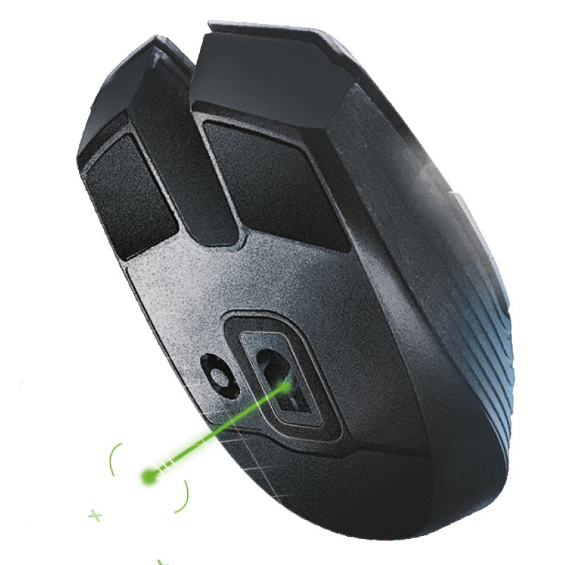 产品使用7200 DPI的光学引擎,回报率1000Hz,最大可达220IPS/30G。鼠标除了左中右三键外,在鼠标左侧还有两个单独侧键,支持编程与宏操作。供电方式使用两节AA电池,官方宣称续航时间可达350小时。