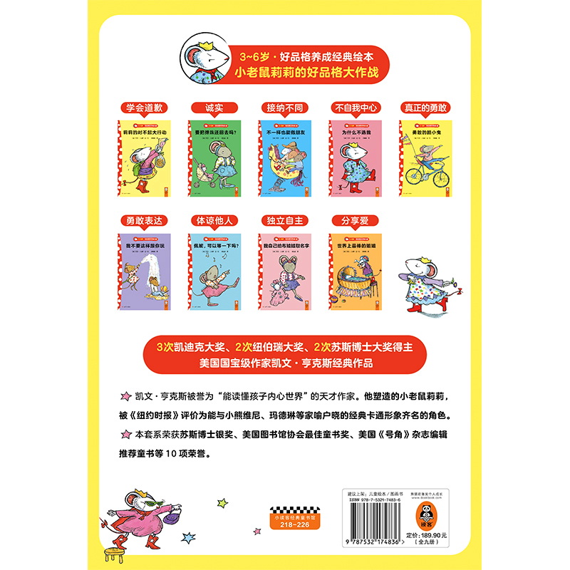 《小老鼠莉莉的好品格大作战(3~6岁·好品格养成经典 套装全9本)》是美国知名童书作家凯文·亨克斯创作的经典绘本,讲述了一个可爱的小老鼠主人公佩妮平时的生活。绘本从小佩妮的出生开始讲起,慢慢涉及其与家庭成员的关系、邻里关系、同学关系、师生关系,还讲述了她与小伙伴们之间发生的有趣故事,很有治愈力。
