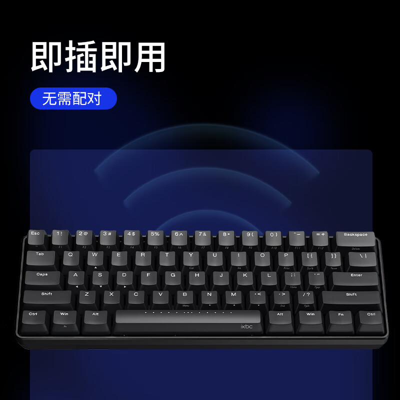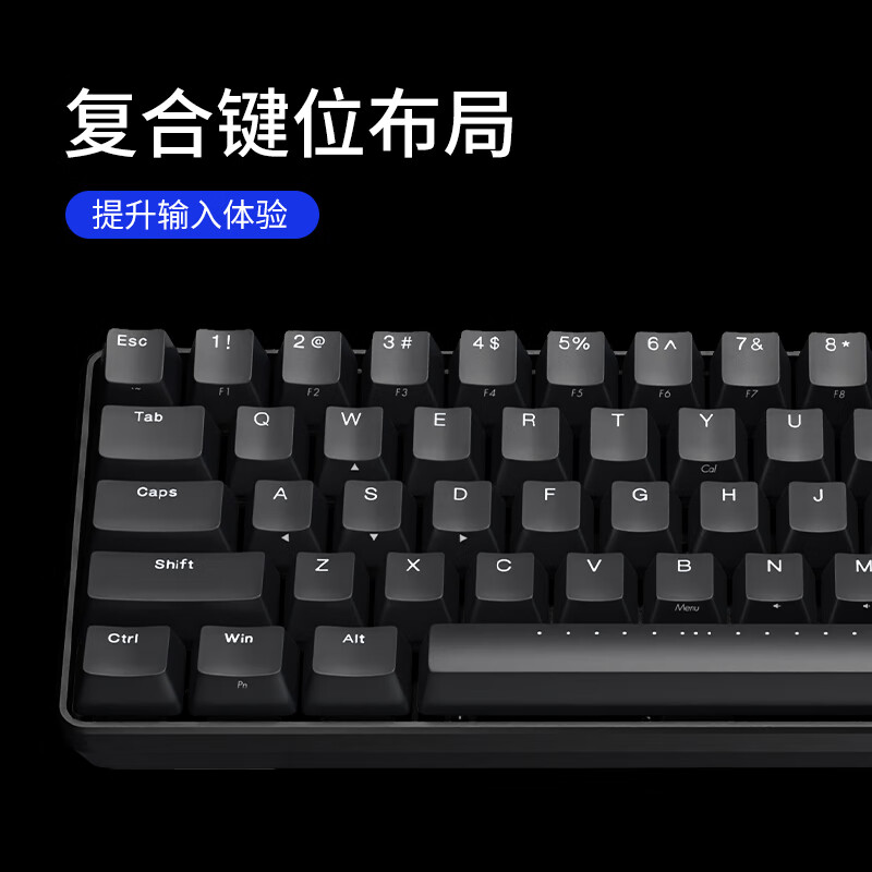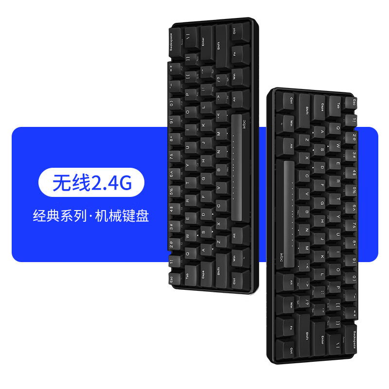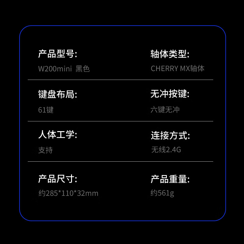 搭载Cherry机械轴体,PBT侧刻键帽,61键布局,2.4G无线连接,两节七号电池供电,支持360小时连续输入,尺寸为28.5*11*3.2cm。拥有Workman/Dvorak/Colemak/Qwerty四种配列,可对左win/右Fn/Caps键等常用键位进行快速切换。