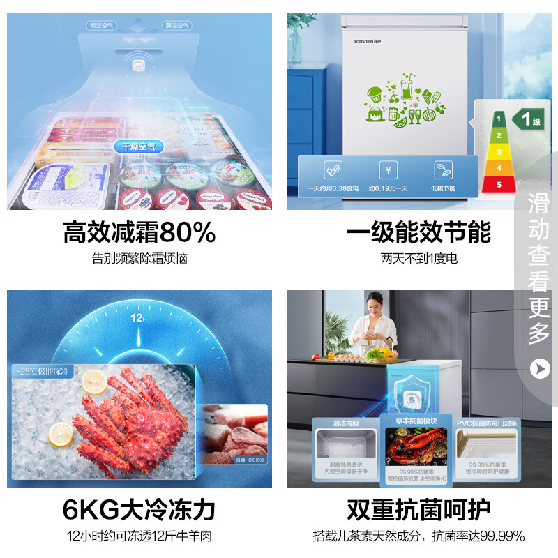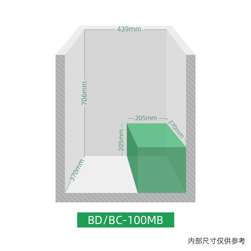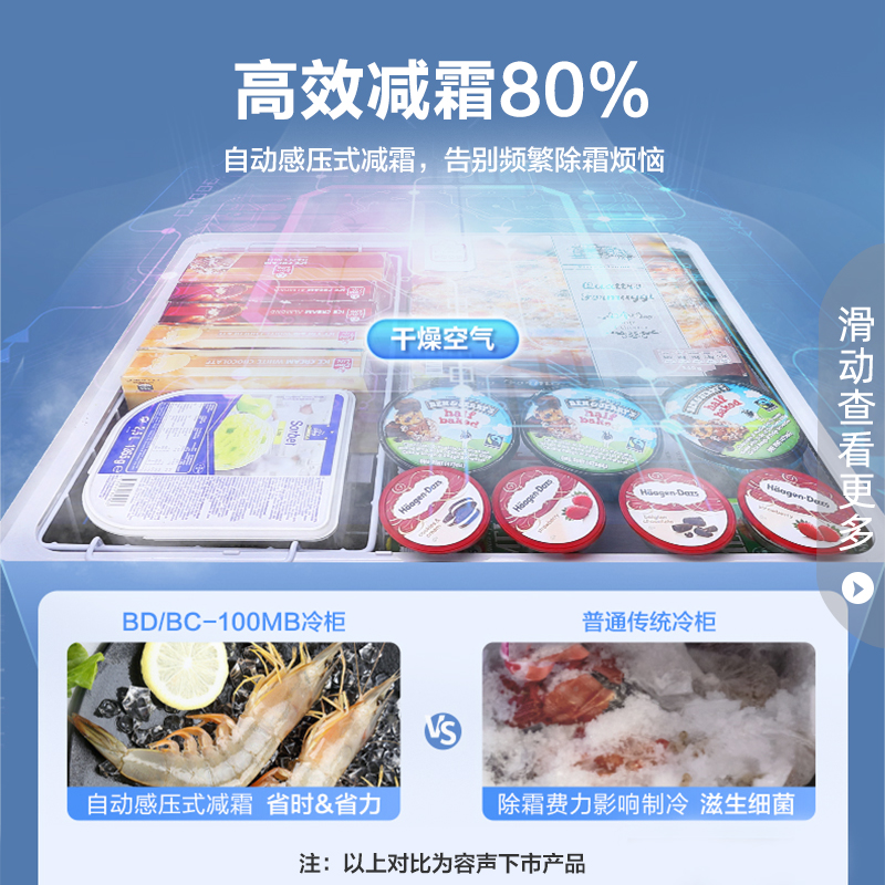 BD/BC-100MB,大容量小占地,断电保护100小时,六维持久养鲜,37分贝低燥运行,6KG冷冻力,食物保鲜长达3-6月,0.3度电/天,八档调温满足不同食材保鲜需求,8档模式自由切换,满足多样食材储存需求,