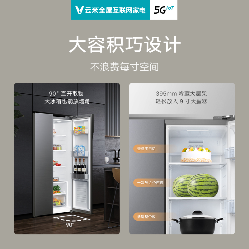 云米(VIOMI)这款型号为BCD-598WMSA的对开门冰箱,内膛容量高达598L,满足多样存储需求。冰箱制冷方式为风冷,采用了压缩机+风机双变频设计,冷冻能力7KG/12H,日冷冻能力0.95KW,达到了1级能效标准。内置4枚感温探头,可精准感知冰箱温度并进行快速调节,实现精准控温。为保证室内空气,内置有天然草本抑菌滤芯,杀菌率高达99.9%,支持拆卸,到期轻松更换。冰箱两侧柜门支持90°直角开门,满足嵌入使用。