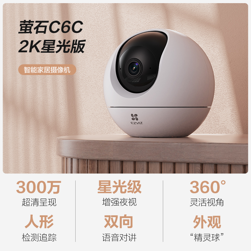 萤石这款C6c 2K星光版智能云台摄像头,配置300万像素,星光级传感器进一步提升感光性能,分辨率最高可达2560x1440P,画质更细腻;搭配智能降噪算法,画面无噪点,更自然、更真实。水平旋转角度可达340°,可视角度可达360°,垂直旋转角度可达130°。步进式电机设计,旋转更稳定。满足多角度观察需求。搭载两颗LED红外灯,夜间照射可达10米,搭配两颗850nm红外补光灯,有效提升夜间画面清晰度。多种AI智能检测,自动捕捉其运动轨迹追踪跟拍。