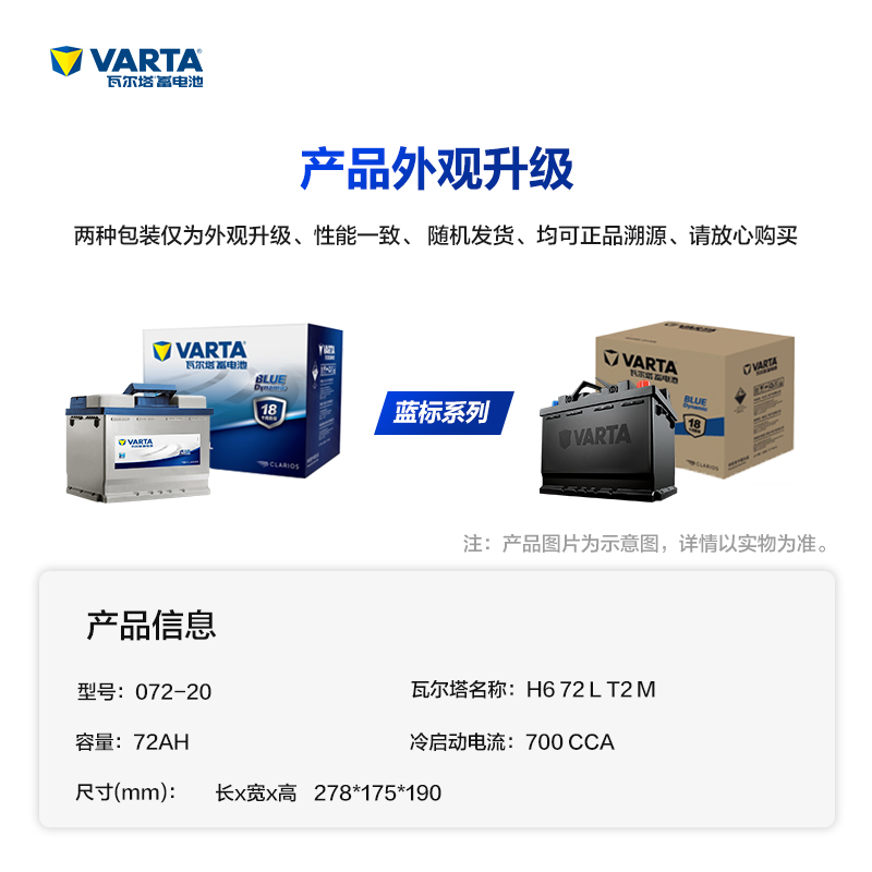 瓦尔塔(VART)在全球蓄电池行业占据绝对优势的领导地位,是世界最大的蓄电池供应商之一。蓝标系列(1)蓄电池不但品质优良、寿命超长,更是目前中国市场上覆盖车型最为全面的产品线之一,适用于市场上91%以上的乘用车。(2)其部分产品外壳设计特别加固了边角,弹性筋条和平底的蓄电池槽,内部设计中启用了热熔胶技术,有效避免震动和冲击对蓄电池的损坏。(3)在低到零下20度的极度低温环境下,依然保持强劲的冷启动电流。即使在高达40度的高温之下,也只有极低的水流流失率,让电池性能时刻表现稳定、持久耐用。(4)通过先进的蓄电池技术和环保的内部零件,做到了提高汽车的燃油效率,而且能耗更低,污染更少,资源利用率更好。此款蓄电池容量为72AH,质保期为18个月。适合大众途观2.0及以上、大众CC、EOS、迈腾、高尔夫6、标致508等车型。