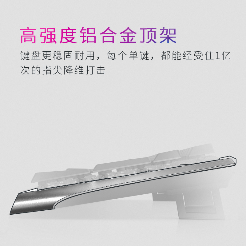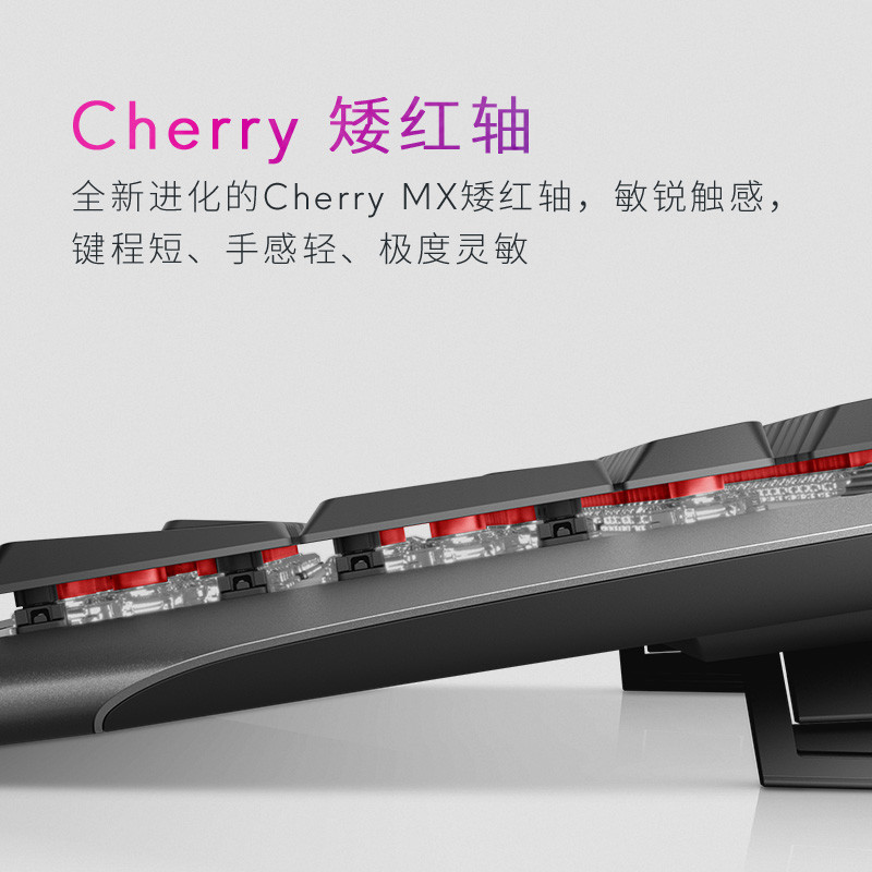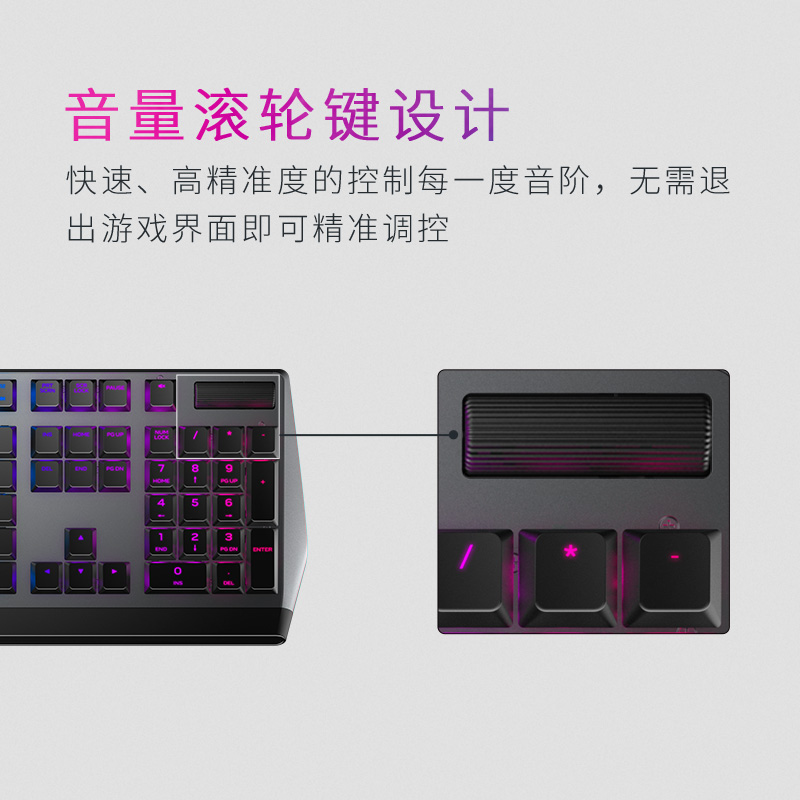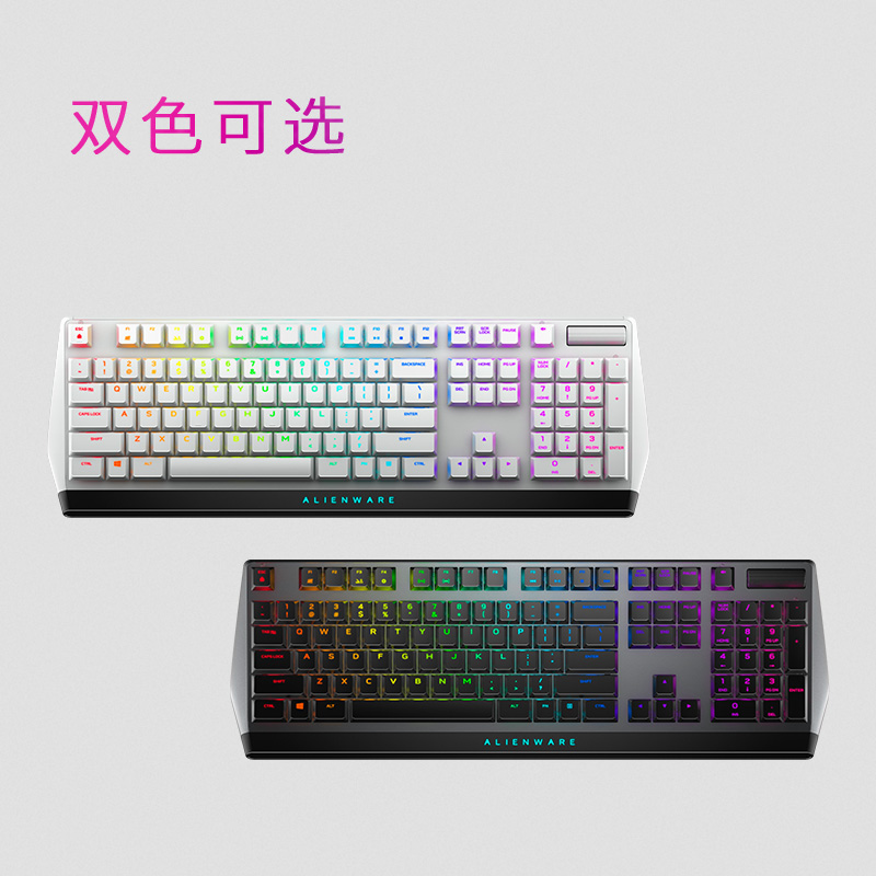 外星人AW510K键盘采用Cherry矮红轴,1.2mm短键程,全键无冲,亲肤涂层,悬浮式结构,紧凑型设计,带AlienFX RGB灯光,单键可调色,高强度铝合金顶架,带音量滚轮,尺寸为46.7*15.62*2.94cm,约重0.91kg。