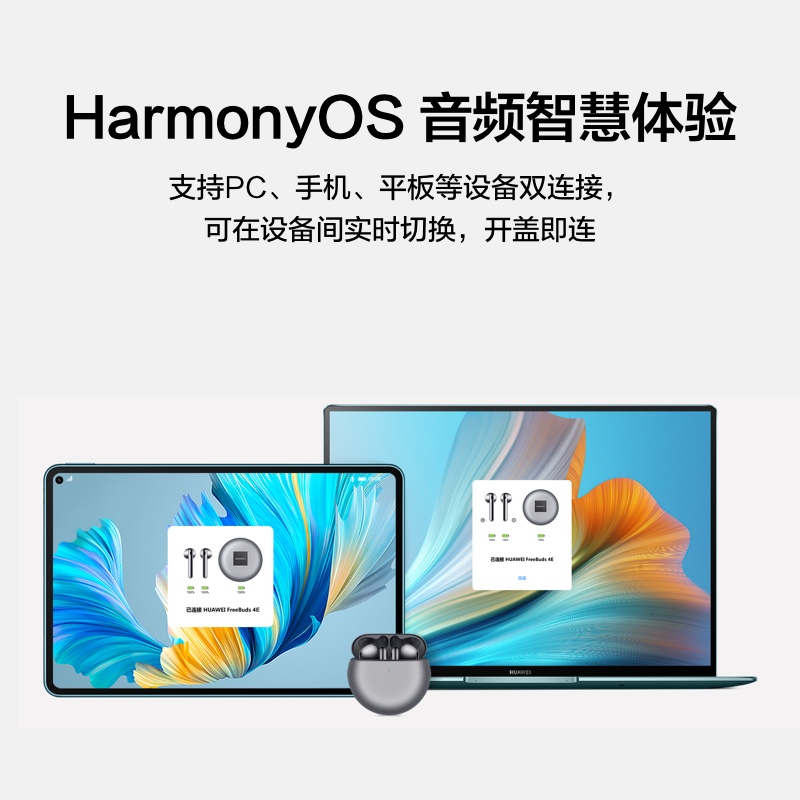 华为 FreeBuds 4E采用半开放式入耳设计,具有良好的通气性,带来更舒适的佩戴体验。搭配人耳自适应降噪技术,适度削减外界低频噪声,支持自适应降噪技术,单耳仅约4.1g,重量减轻10%,带来空气感舒适佩戴,搭载AEM人耳自适应音效技术,14.3mm直径宽音域发声单元,声音频率范围高达40kHz,让高音通透而丰满,高密闭性的独立声腔与空气导管组成一套低频增强引擎。支持滑动触控,拥有HarmonyOS 2 技术,搭配充电盒最高续航22小时。可以实现个性化弹窗设定、音频万能卡片、听歌识曲、通知播报等丰富的智慧功能。