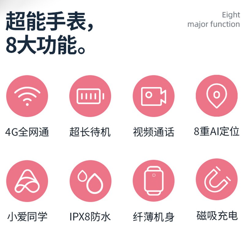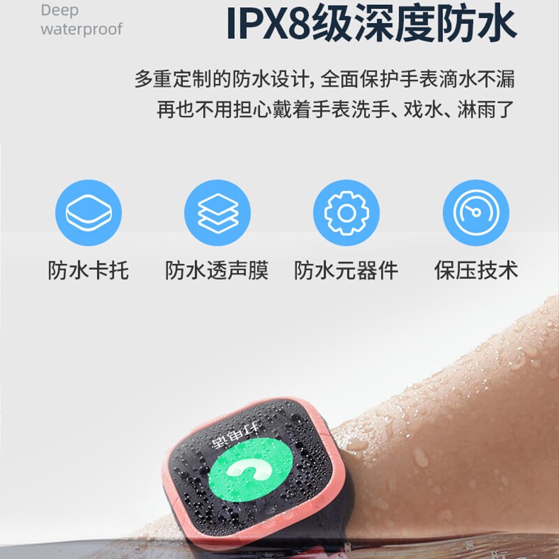 内置 800mAh 大容量锂电池,支持 4G 全网通,支持视频通话和定位同步显示在手机上,配置前置摄像头,拥有 GPS、北斗、基站、WIFI、AGPS、Gsensor、室内定位、AI定位 8 重 AI 定位。拥有 IPX8 级深度防水。