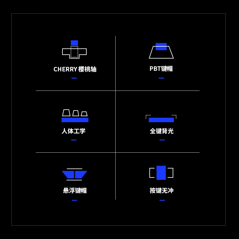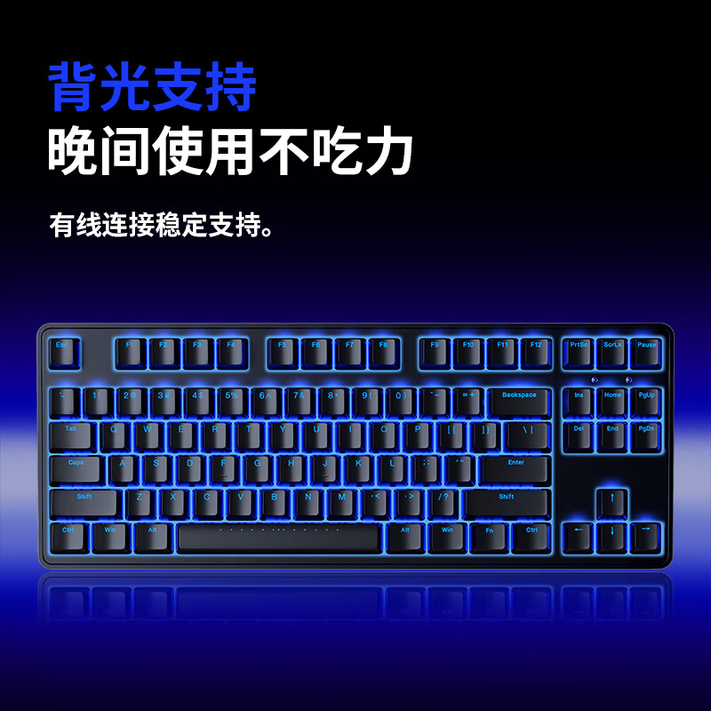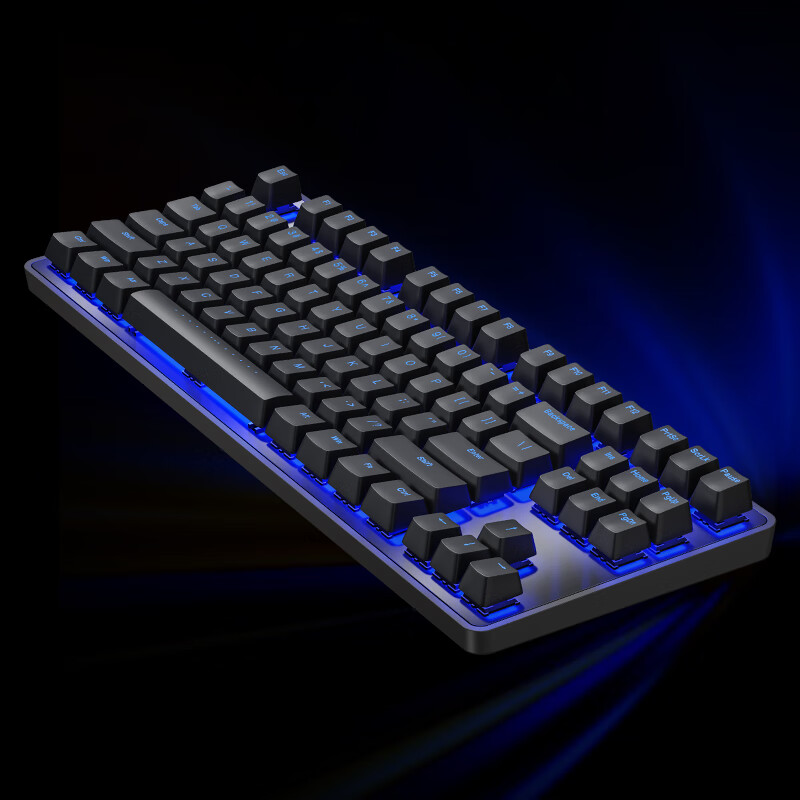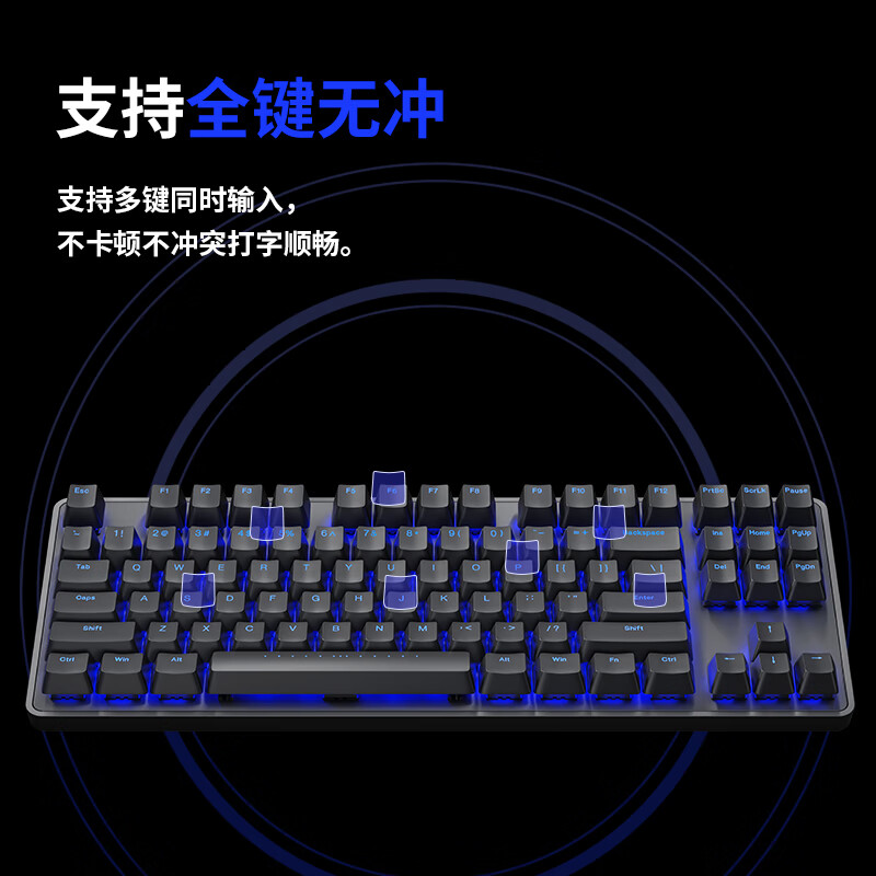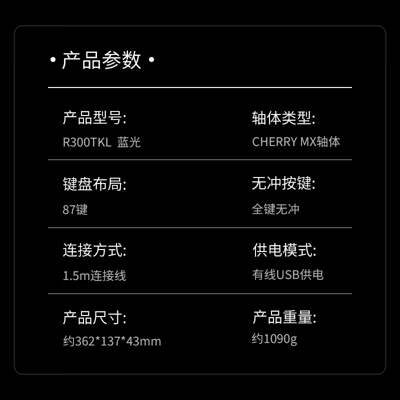 R300系列机械键盘使用CHERRY MX轴体,红轴、茶轴、青轴可选。双色PBT键帽,TKL87键位,并采用悬浮设计,蓝色背光,可调节明暗快慢,双层PCB电路板。