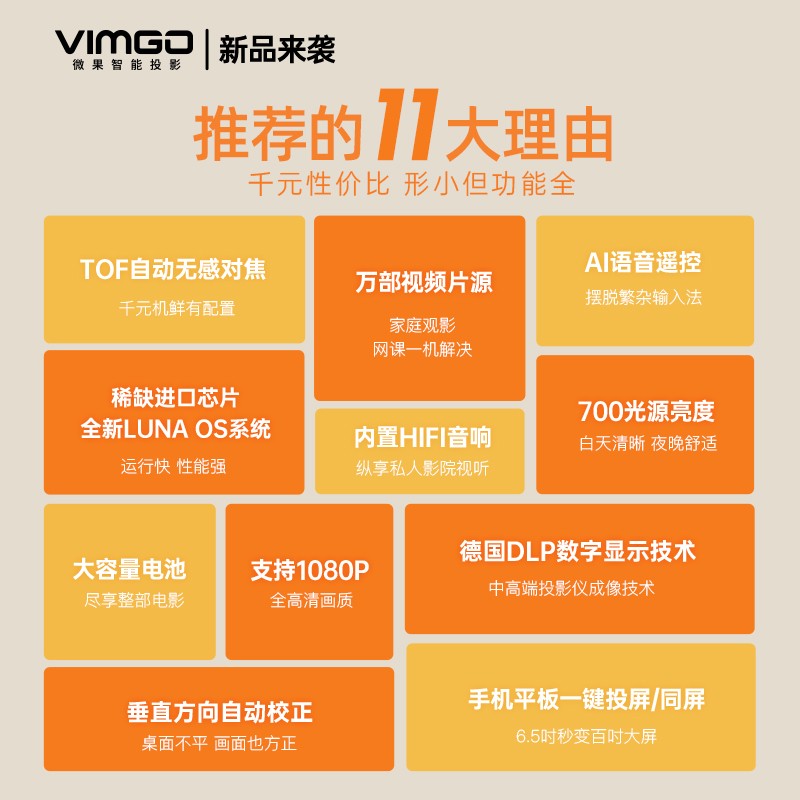 700*光源流明,1.36:1投射比,离墙2.4米即可投射80吋大屏,小房间也能拥有大画面。TOF自动无感对焦,0.1秒瞬时清晰,移动过程实现超快速对焦,不出现对焦图案,观影无干扰。自动梯形校正,画面时刻方正,100%OFF-SET偏称轴设计,抛开支架平放桌面,精彩完整呈现。