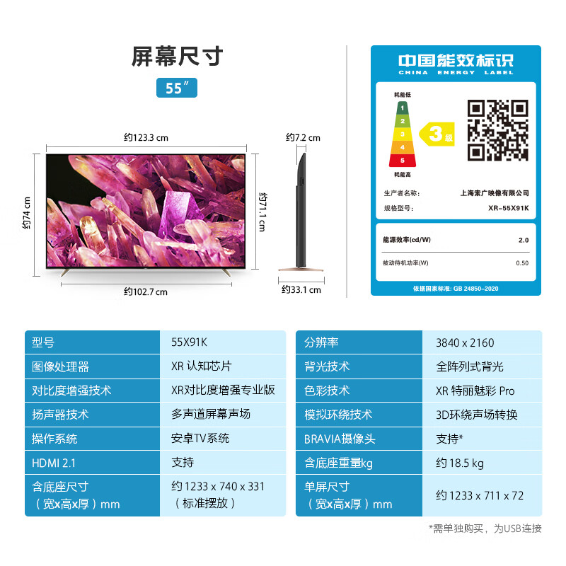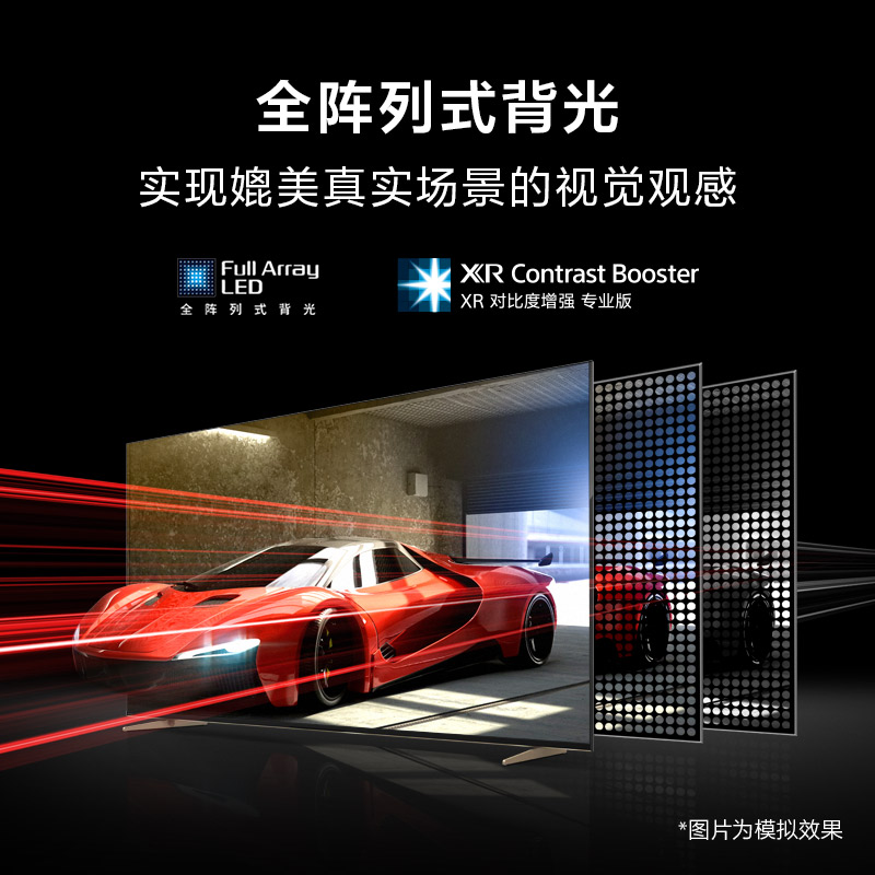 画质方面:全阵列式分区背光,进一步增强的XR认知芯片的驱动,配合其所搭载的XR对比度增强专业版,更为精准细腻的背光控制,有效增强黑色层次、亮度和原生对比度,呈现出更接近真实、更有立体感的画面。同时,XR特丽魅彩Pro、XR 4K倍线技术、XR明锐动态等优化技术,大幅提升画面的对比度和色彩表现,也进一步改善了画面的清晰度,用户得以体验到细节丰富、色彩明艳、光影效果优异的画面效果。 游戏方面:2个HDMI 2.1接口,支持4K/120FPS输入/显示、VRR可变刷新频率、ALLM自动低延迟模式,为PS5定制的HDR自动映射、内容自适应图像模式。 音质方面:多声道屏幕声场技术,利用高频声场定位扬声器,输出与画面源位置匹配的声音,基于XR认知芯片,3D环绕声场转换技术,带来虚拟环绕声体验。 其它:支持AI远场语音,环境光感自动调整亮度,新款易用易清洁遥控器 ,安卓TV系统,内存容量为4GB+64GB。