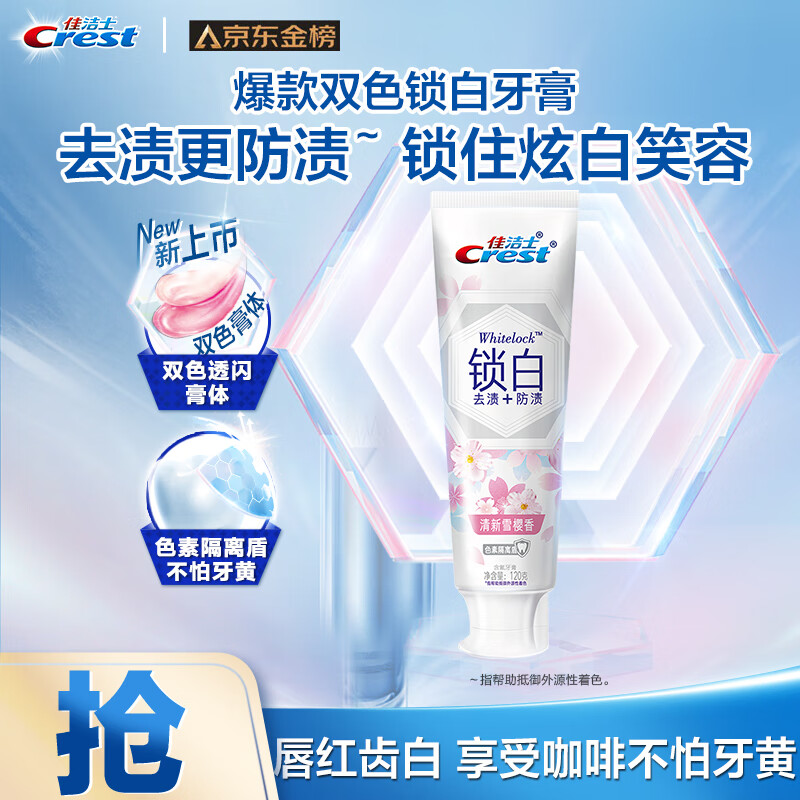 Crest佳洁士3D炫白牙膏一直有着很好的口碑,近期全新推出的锁白系列的致尚技术牙膏,提出了全新的牙齿美白理念,采用了宝洁研发的“锁白”成分,附着牙齿表面形成保护伞,既清洁牙齿污垢,又能一定程度抵御日常的食物染色。同时,选择了全新的花香口味,让清甜沁脾的香味在口中蔓延,增加刷牙时的舒适感,持久清新口气,晶莹透亮的膏体演值颇高。