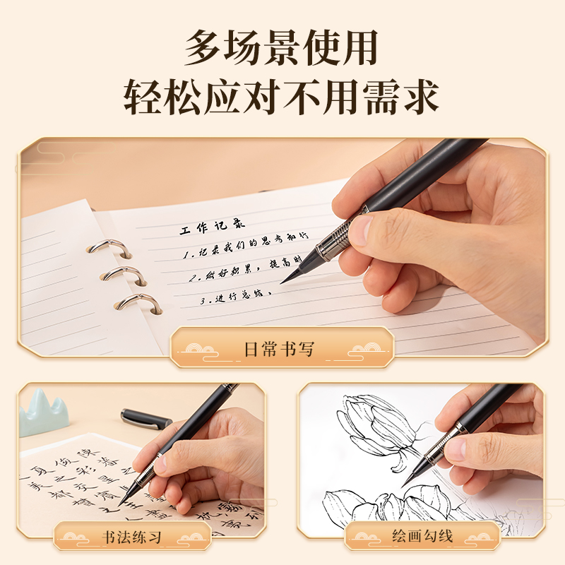 deli 得力 钢笔式毛笔,内置吸墨器和4支墨囊,笔头不易分叉。可吸墨器上墨,也可替换墨囊上墨;可毛笔握法,可钢笔握法,两种握法轻松上手;采用PVC包装盒。适于多种书写需求:艺术签名,书法撰写,插画绘画,可用来练字、抄经、画画、签名。