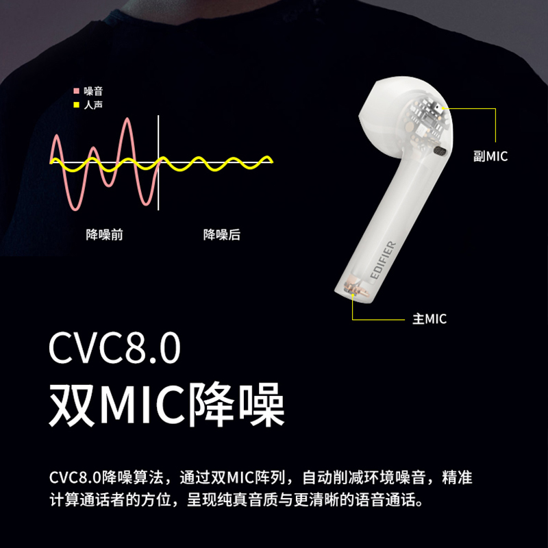 Lolli Pods内置13mm液晶高分子振膜,采用高通QCC3020蓝牙芯片组,支持aptX音频解码,配备LDS镭雕天线,通过双MIC阵列实现CVC8.0降噪算法,半入耳设计,单次续航6小时,配合充电盒可实现24小时续航。