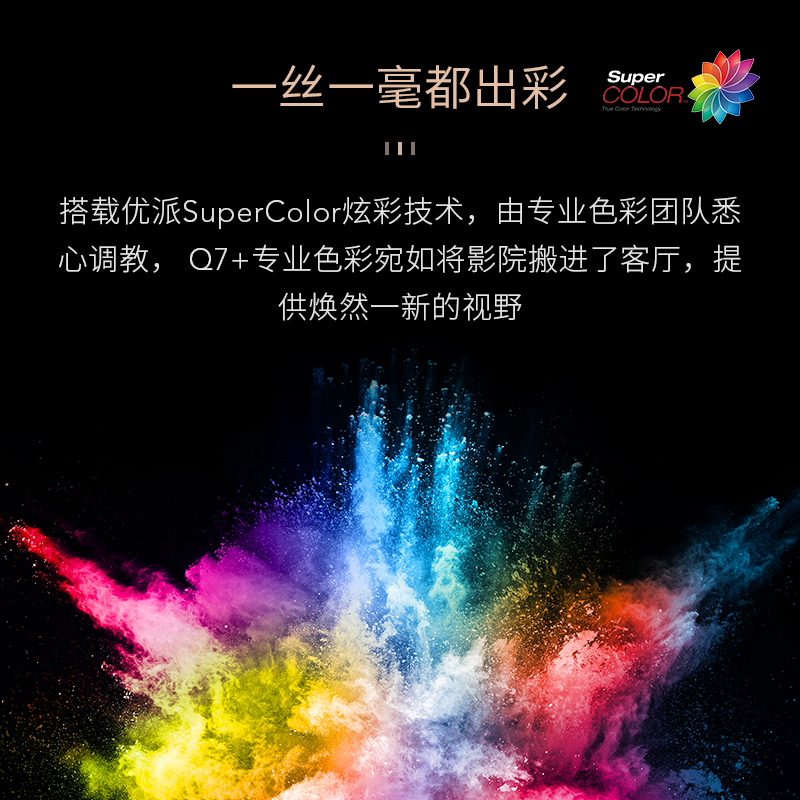 优派 Q7+是优派Q系列的最新款投影仪,硬件分辨率为1080P,亮度为1200ANSI,投射比为1.2:1,2.6米即可投出百吋屏幕,相比上代产品,Q7+将镜头调整至中置,对于吊装来说更为友好。 Q7+搭载Super Color炫彩技术,由专业色彩团队调校,配合1080P分辨率及1200ANSI亮度,满足家庭影院需求,球面玻璃镜头保证画面稳定不变形不虚焦,有效降低色散。MEMC技术搭配HDR10动态优化,投影画面细腻真实,明暗对比更强,展示更多细节,高清赛事和动作大片一览无余。 支持智能AI语音,搭配遥控器即可实现更多功能,无线投屏让智能设备小屏变大屏。另外该机采用古铜金配黑色,颜值较高,同时支持蓝牙音箱功能,一机两用。