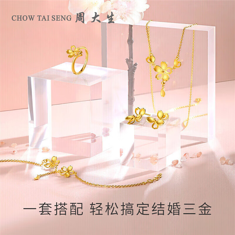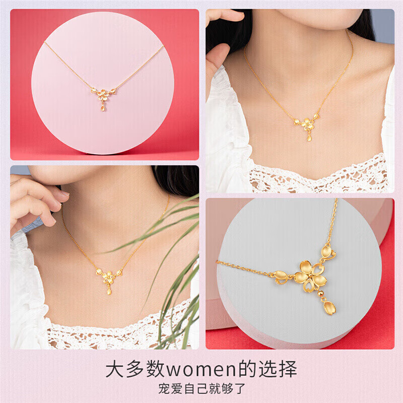 CHOW TAI SENG 周大生 花漾系列 G0PC0151XL 樱花足金项链,采用五分之三的实心花瓣设计,搭配短流苏垂坠,温柔细腻,精巧别致。足金项链表面采用喷砂工艺,细致柔和的磨砂质感,让项链整体具有更强的层次感。无论从工艺质感还是细节设计,都满足了轻婚夫妇对时尚和品质的需求。