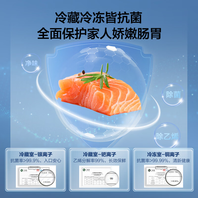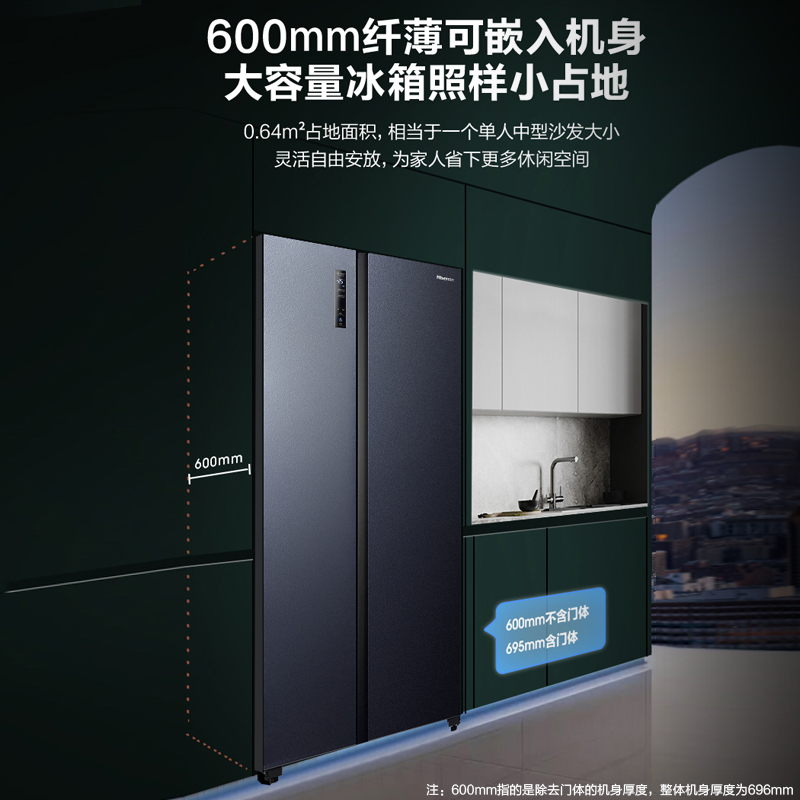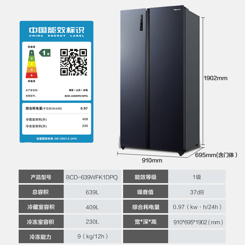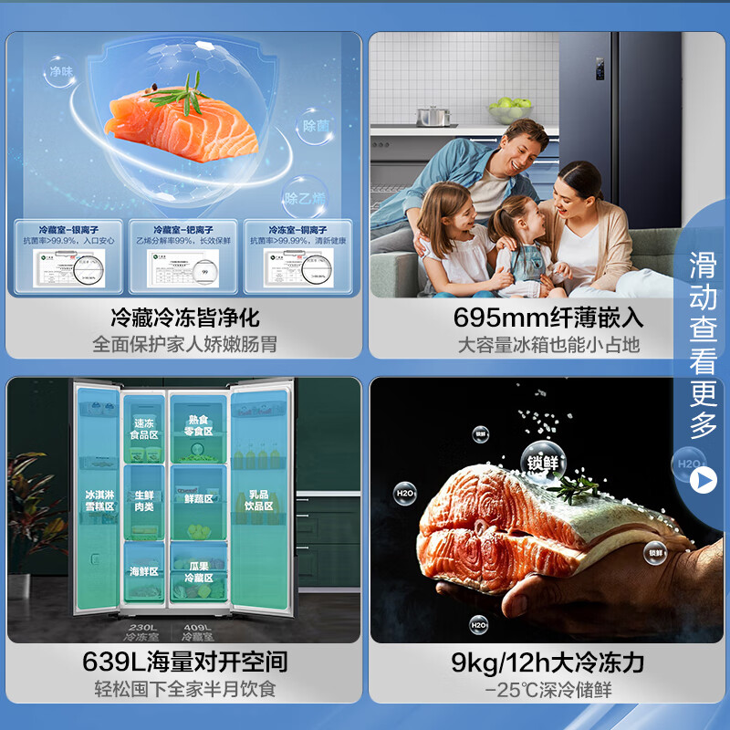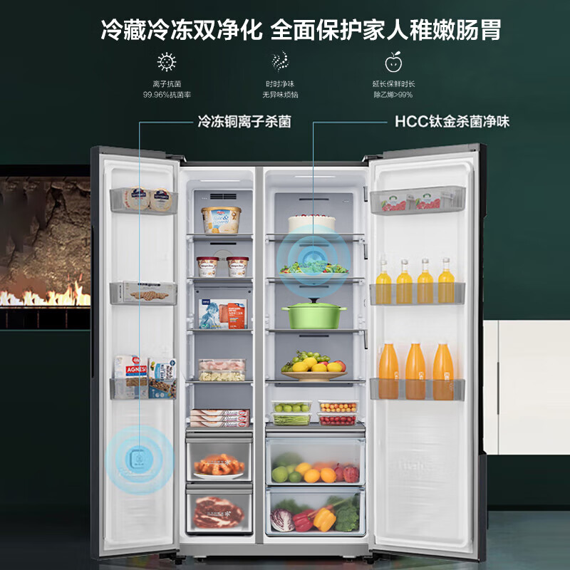 海信 BCD-639WFK1DPQ 双开门冰箱639升,HCC钛金杀菌净味技术,针对常见细菌,抗菌率高达99.96% 此夕卜冷藏室更有低温触媒净味,钯离子除乙烯等大大延长保鲜时长。639L大容量 全家2周食材囤藏soeasy,喜欢的食材随心买,随心囤。矢量变频压缩机+多频离心风机,双变频系统自动调节 食材均匀受冷,机器平稳运行,低耗节能,低噪低音,温柔相伴。1天不到1度电,立体双风幕系统运行,防止漏冷;雷达上下双感温,确保恒温保鲜 制冷更快更均匀,避免食材直吹、不结霜,无需手动除霜。